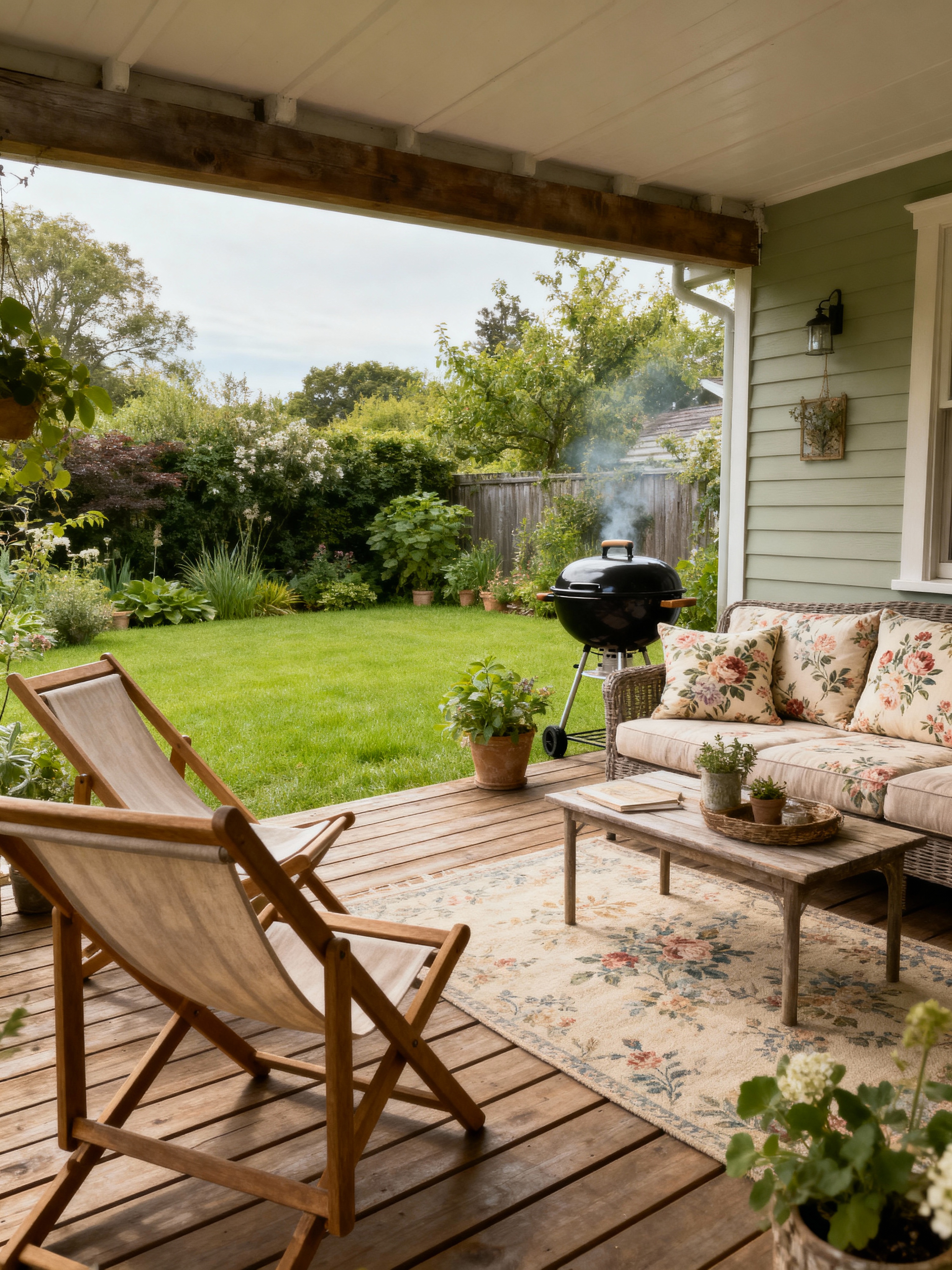 outdoor patio with cottagecore style with plant and deck with deck chairs and grass and barbeque or grill and patio couch with pillows and plant. . with organic and country style and earthy and traditional and cottage style and muted colors and floral patterns and rustic