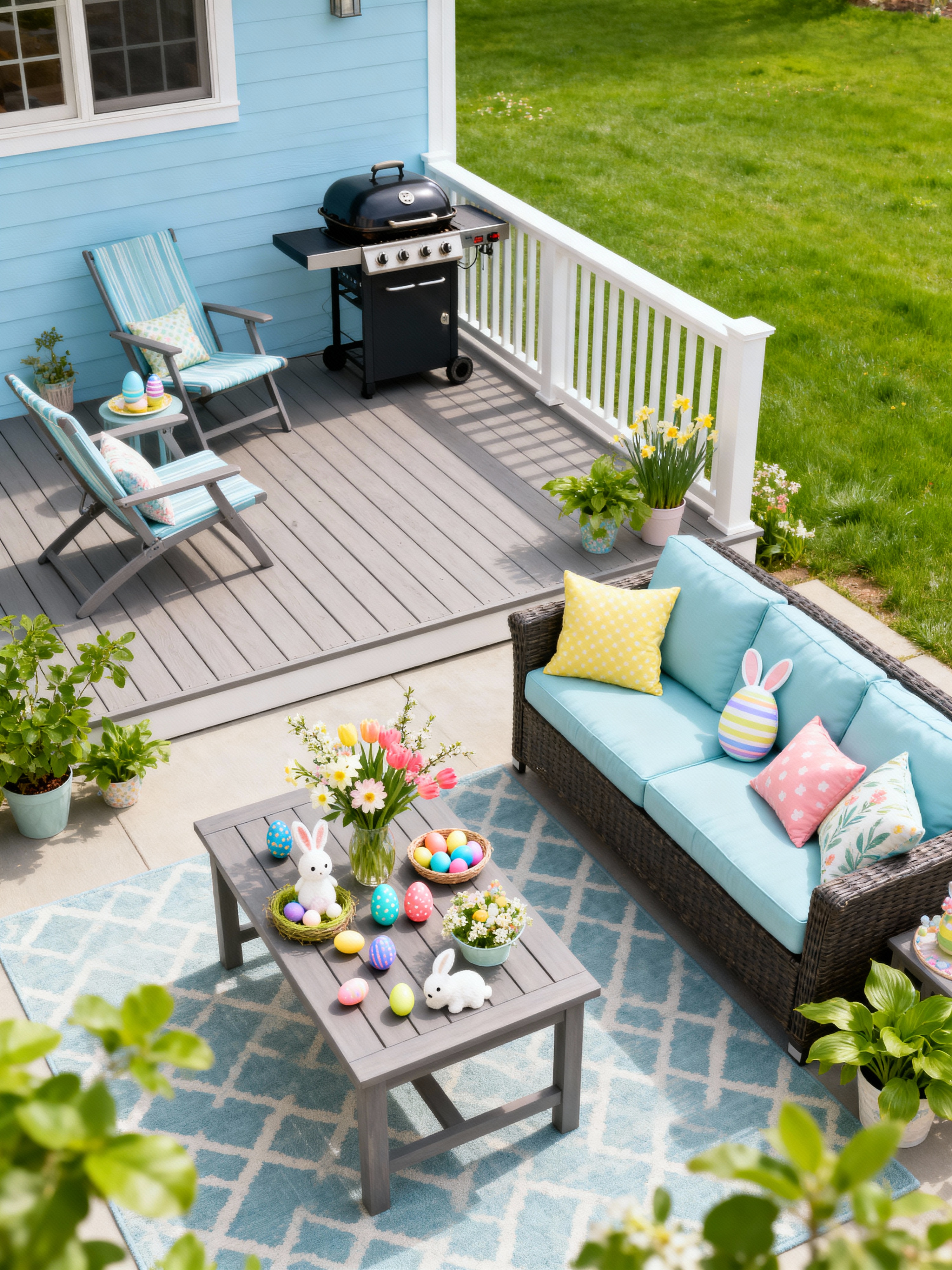 outdoor patio with easter style with barbeque or grill and deck with deck chairs and grass and patio couch with pillows and plant and barbeque or grill. . with light blue colors and flowers on table and spring decorations and easter decorations and colorful easter eggs and light blue colors