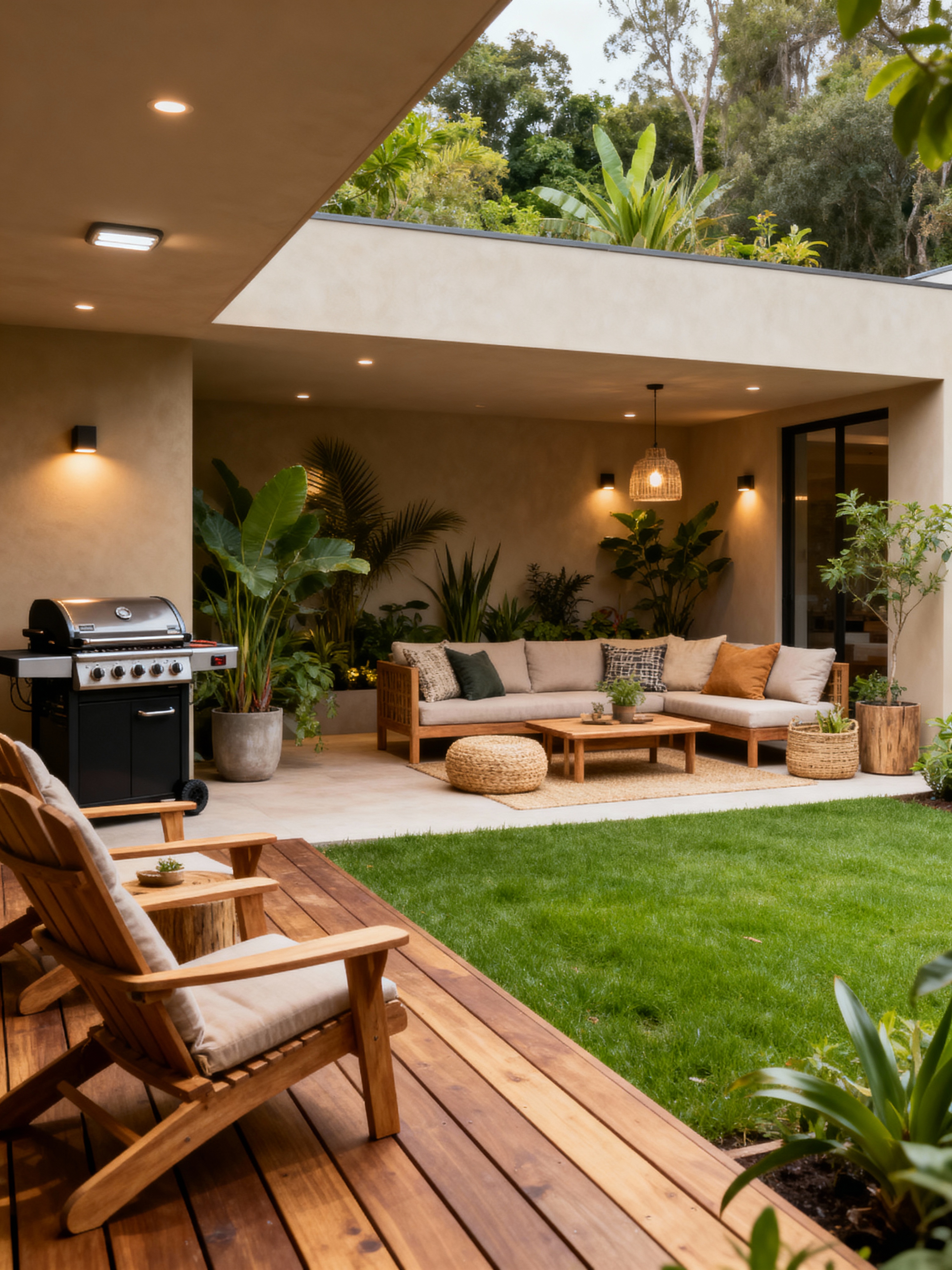 outdoor patio with eco-friendly style with deck with deck chairs and barbeque or grill and grass and patio couch with pillows and plant and deck with deck chairs. . with energy efficient and non-toxic finishes and recycled elements and renewable resources and natural fibers and organic textiles and environmentally conscious and green living