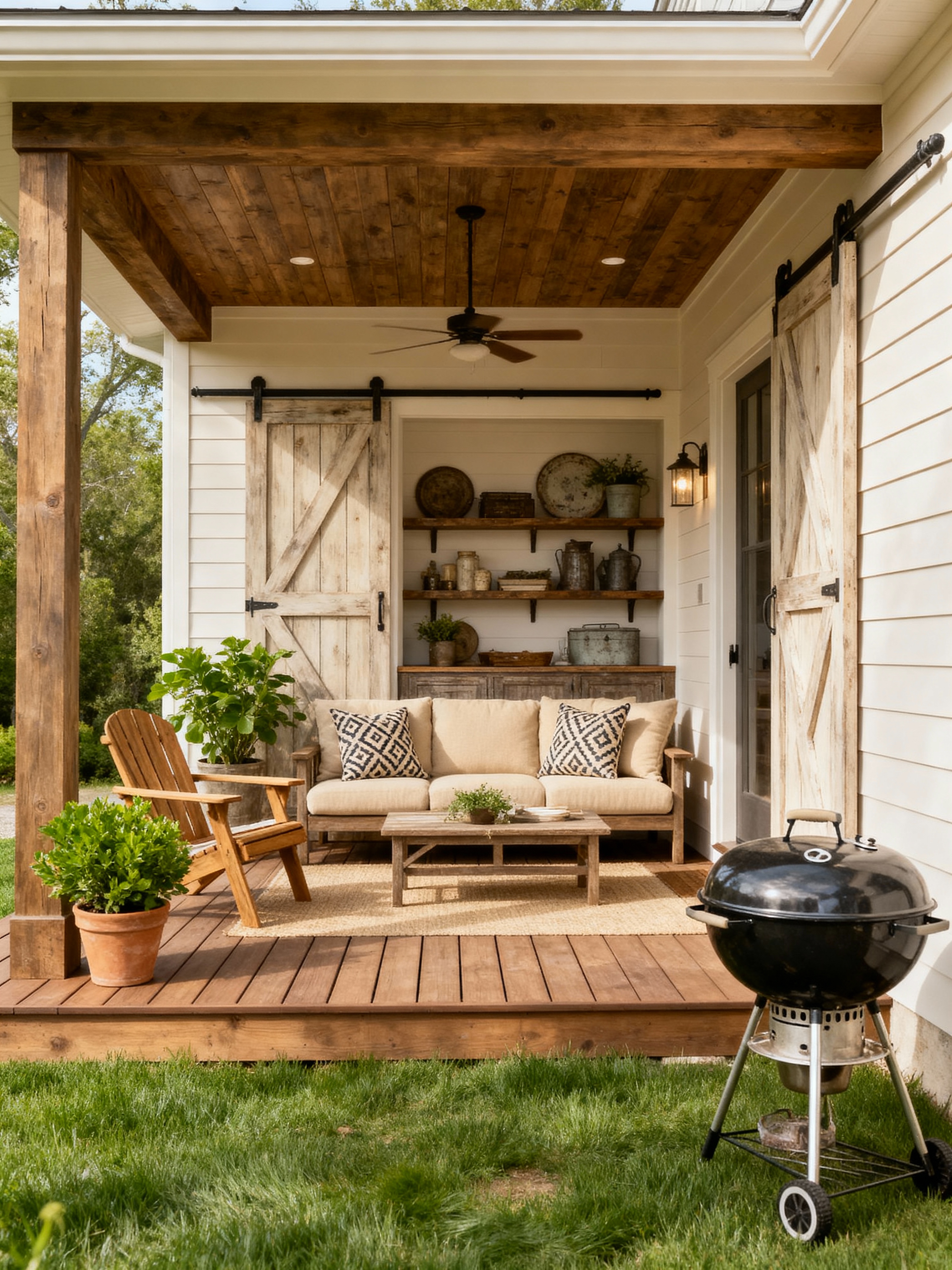 outdoor patio with farmhouse style with patio couch with pillows and deck with deck chairs and plant and grass and barbeque or grill and patio couch with pillows. . with country style and exposed wood and open shelving and cozy feel and barn doors and neutral tones and shiplap walls and vintage decor
