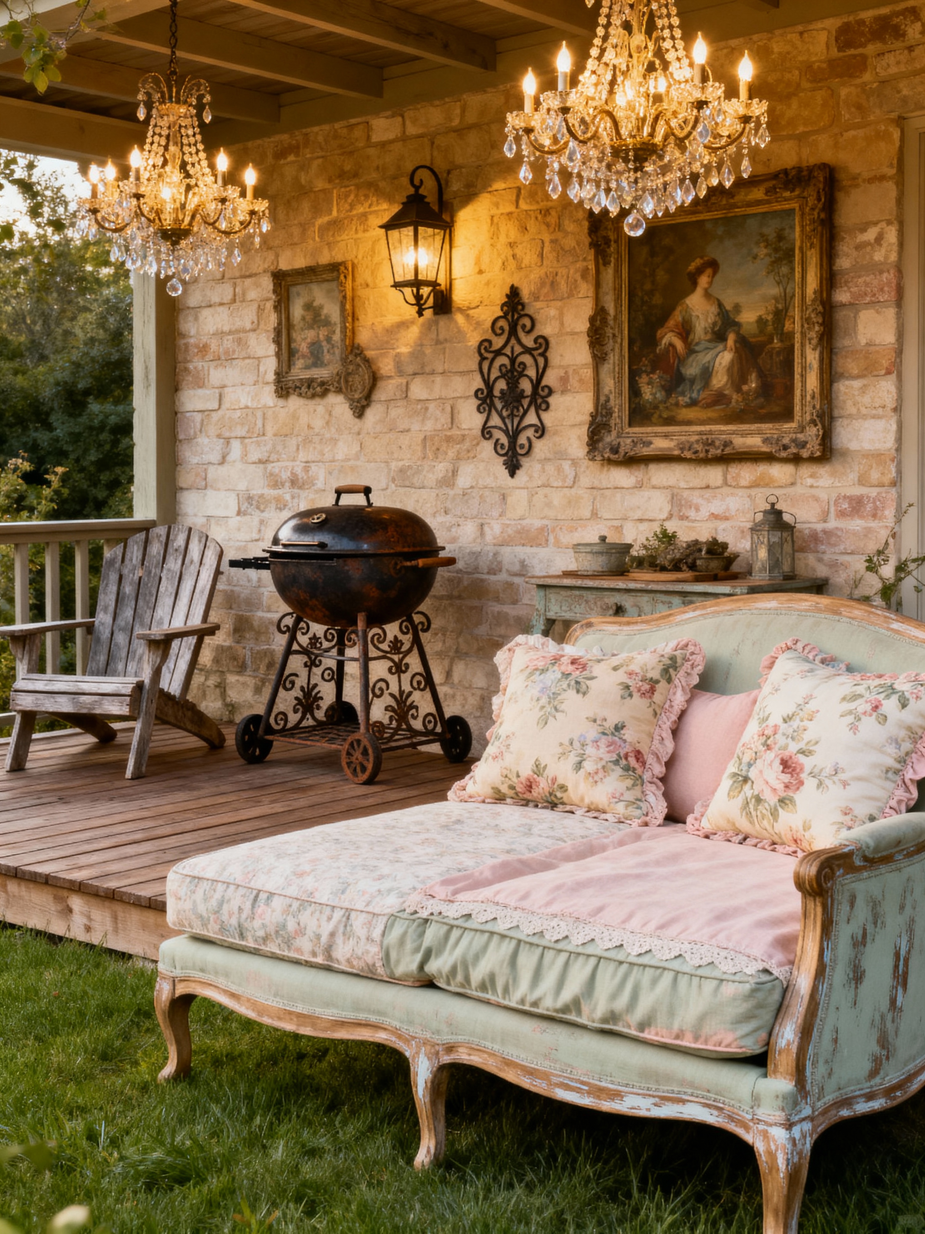 outdoor patio with french country style with patio couch with pillows and plant and deck with deck chairs and barbeque or grill and grass and patio couch with pillows. . with elegant rustic and ornate details and chandeliers and soft fabrics and distressed wood and antique decor and vintage furniture and textured walls