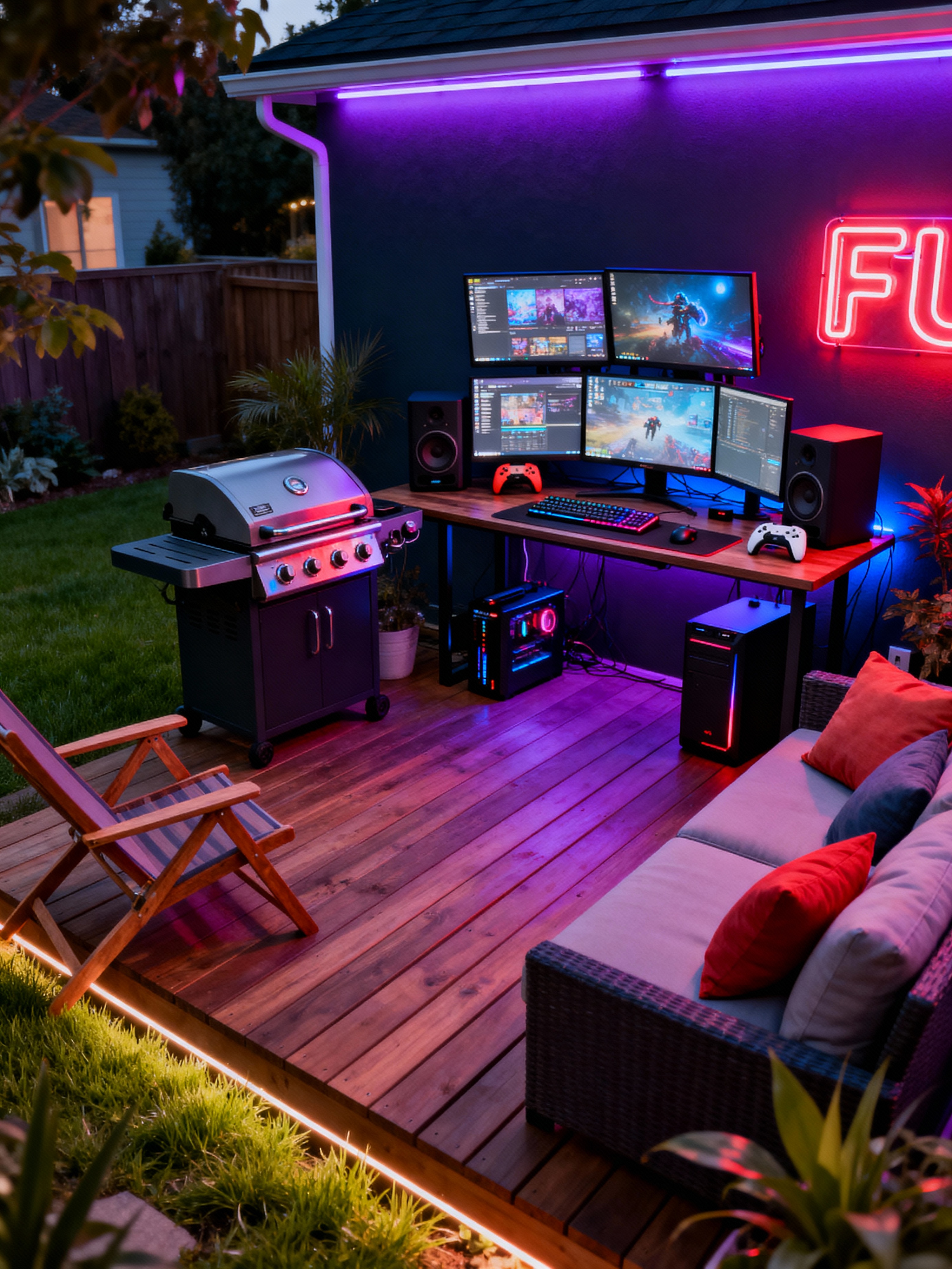 outdoor patio with gaming room style with deck with deck chairs and grass and plant and patio couch with pillows and barbeque or grill and deck with deck chairs. . with purple, red and blue fade light and neon letters on wall and neon lights and speakers and multiple displays and dark walls and computer desk with computer displays and keyboard and video game consoles