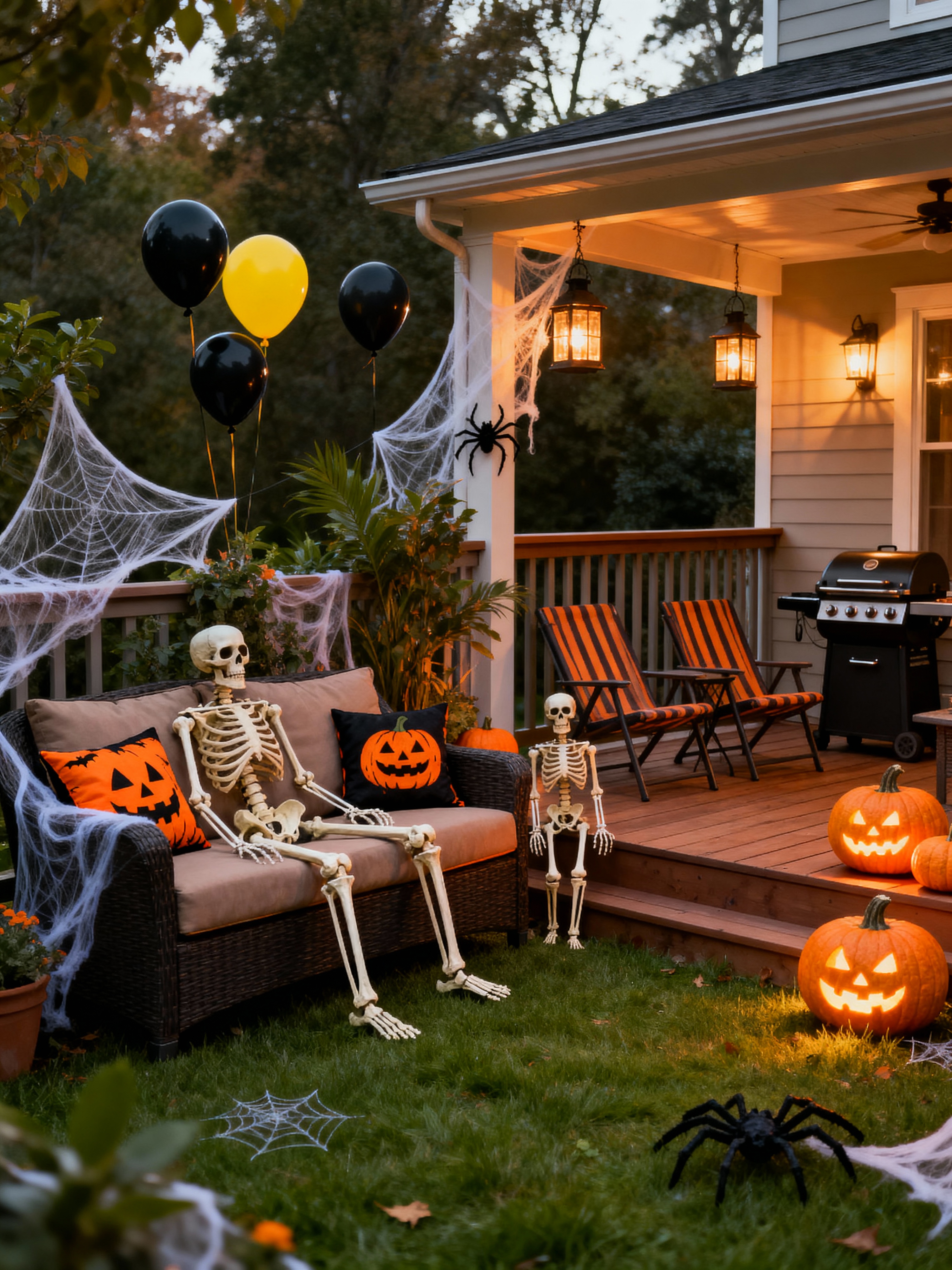 outdoor patio with halloween style with plant and patio couch with pillows and deck with deck chairs and barbeque or grill and grass and plant. . with skeletons sitting and standing and spiderwebs and lanterns and yellow black balloons and glowing pumpkins and cobwebs and cobwebs and lanterns