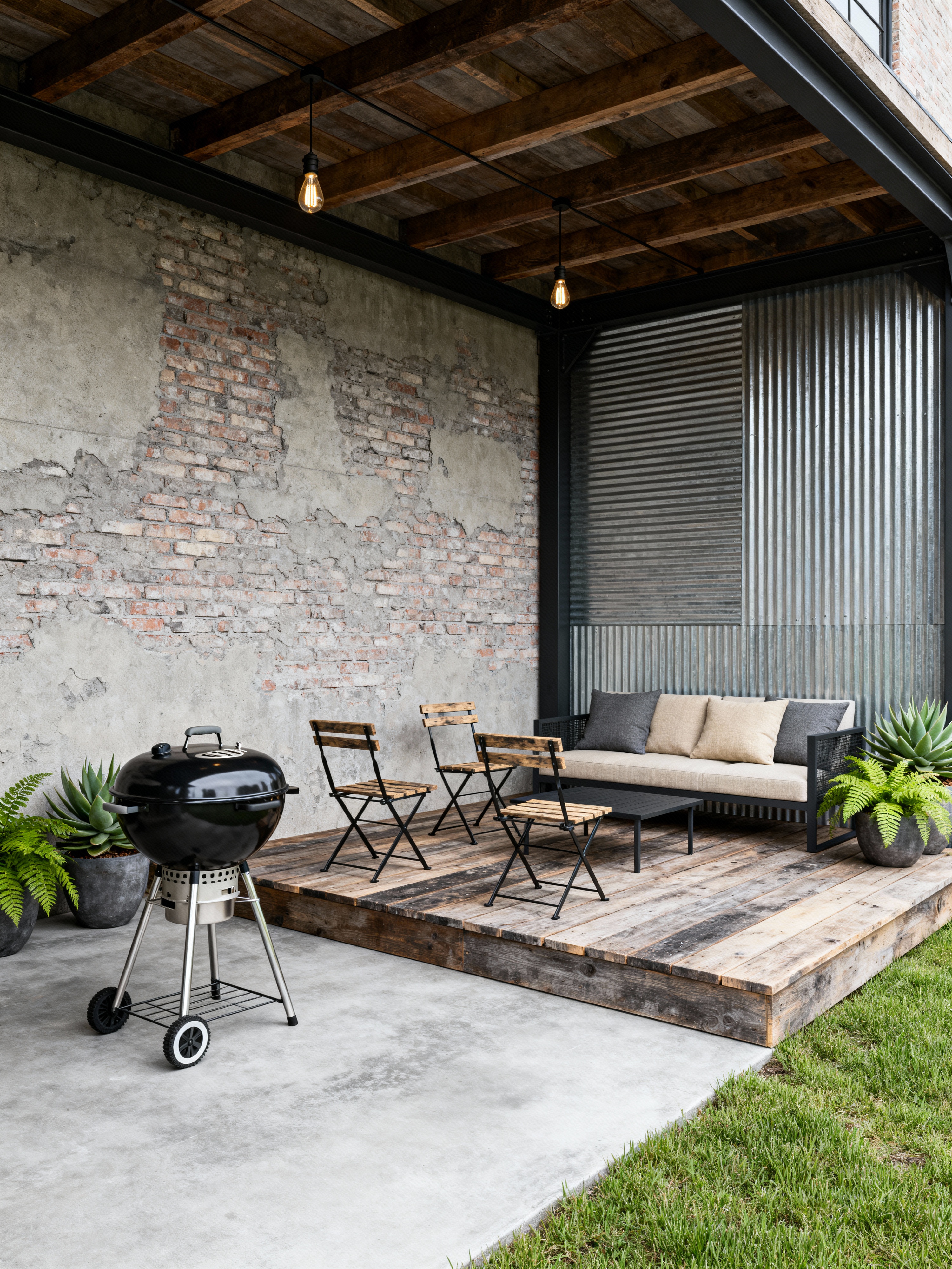 outdoor patio with industrial style with barbeque or grill and plant and deck with deck chairs and patio couch with pillows and grass and barbeque or grill. . with exposed brick and raw aesthetic and exposed concrete and reclaimed wood and metal panels and exposed rafters and neutral tones and factory style