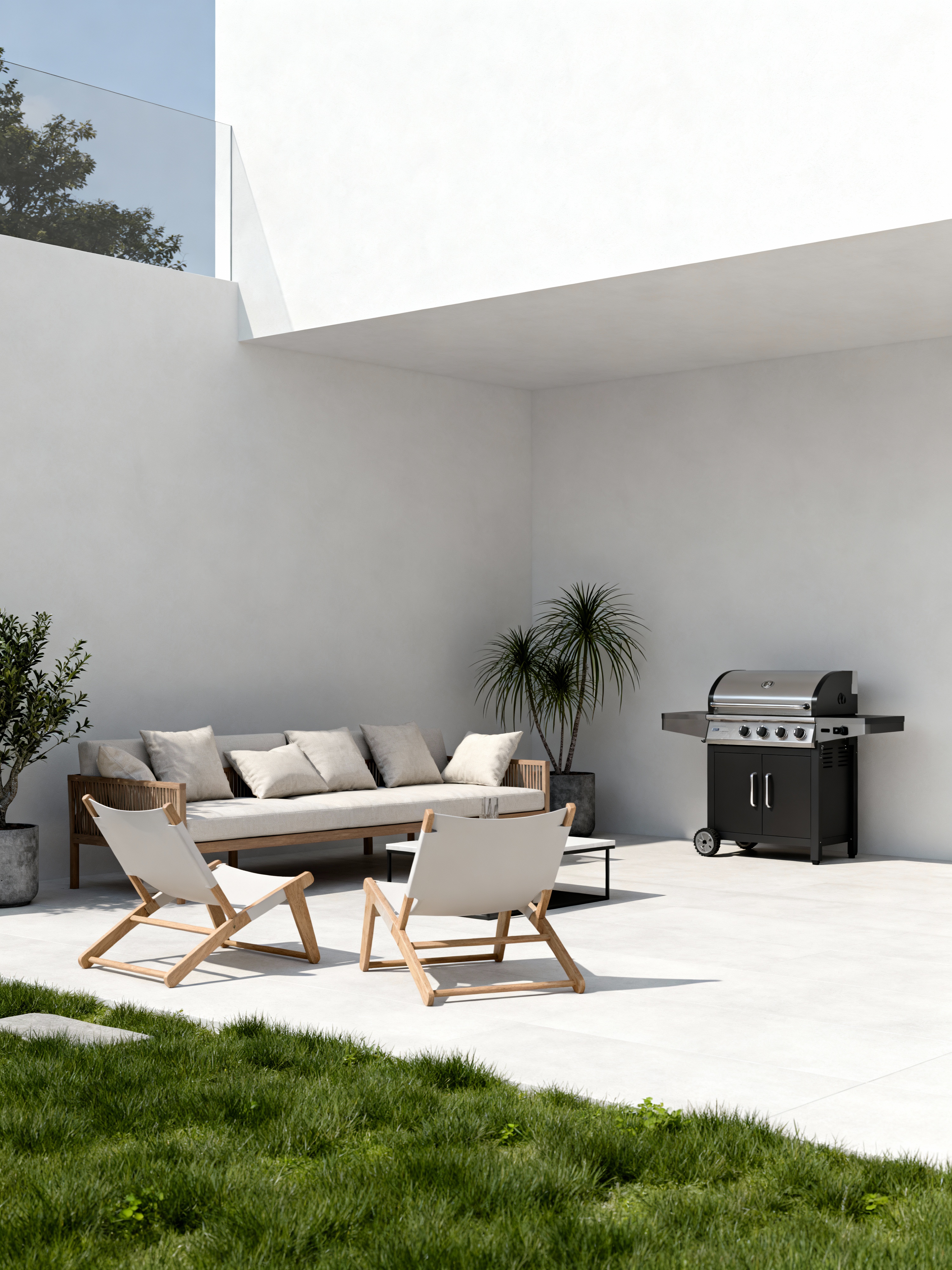 outdoor patio with minimalist style with patio couch with pillows and deck with deck chairs and barbeque or grill and grass and plant and patio couch with pillows. . with lots of light and a monochromatic palette with colour used as an accent and focus on the shape, colour and texture of just a few of essential elements and an open floor plan and functional furniture and clean lines and lots of light