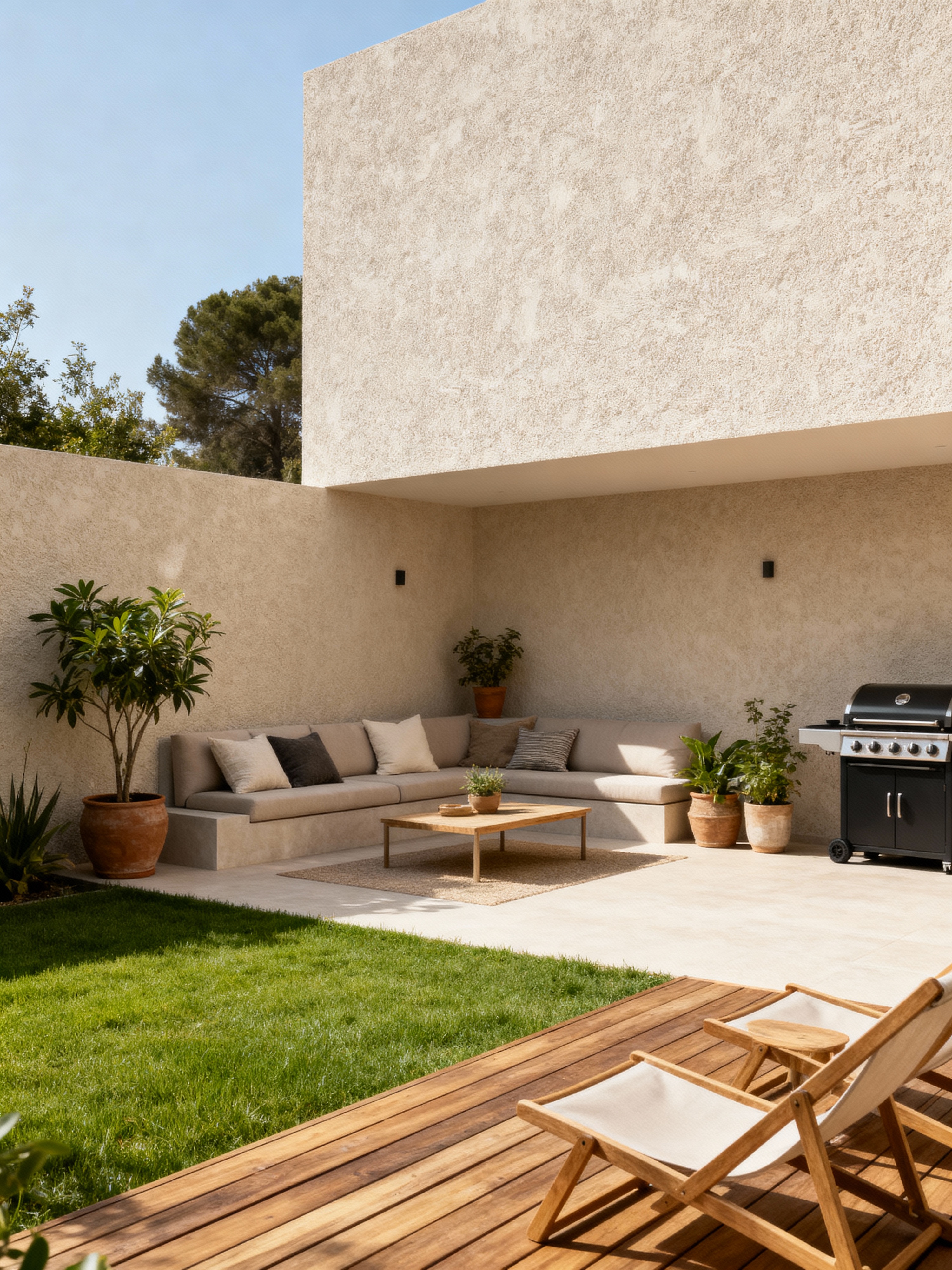 outdoor patio with modern style with patio couch with pillows and plant and grass and barbeque or grill and deck with deck chairs and patio couch with pillows. . with natural materials and elements and open and natural lighting and simple, clean lines and simplistic furniture and neutral walls and textures and practicality and functionality and natural materials and elements