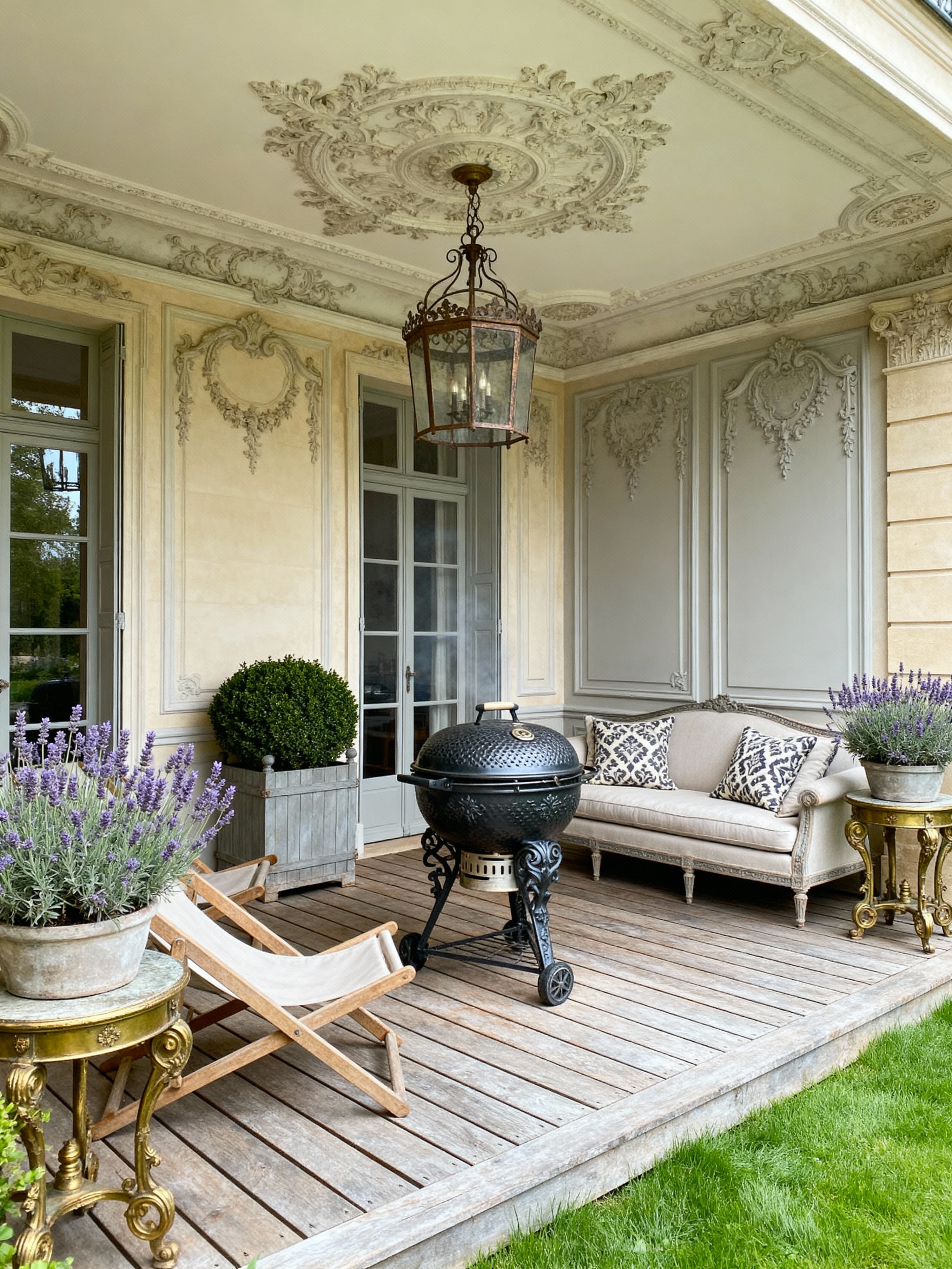 outdoor patio with parisian style with barbeque or grill and plant and patio couch with pillows and deck with deck chairs and grass and barbeque or grill. . with european flair and ornate moldings and classic details and neutral palette and sophisticated charm and vintage pieces and timeless beauty and antique furniture