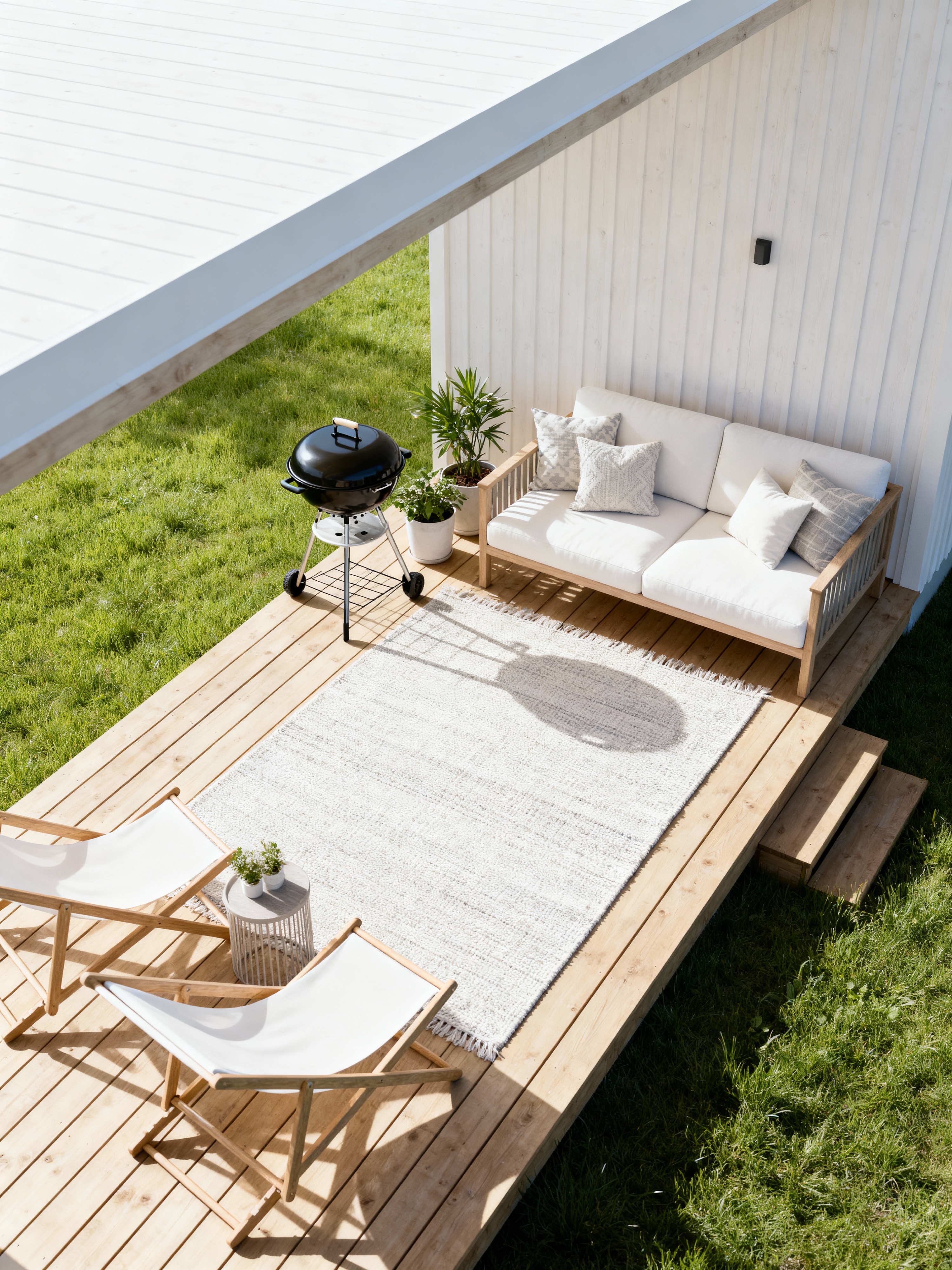 outdoor patio with scandinavian style with barbeque or grill and grass and deck with deck chairs and patio couch with pillows and plant and barbeque or grill. . with light wood and textured fabrics and simple elegance and natural light and clean lines and minimalist design and functional furniture and white decor
