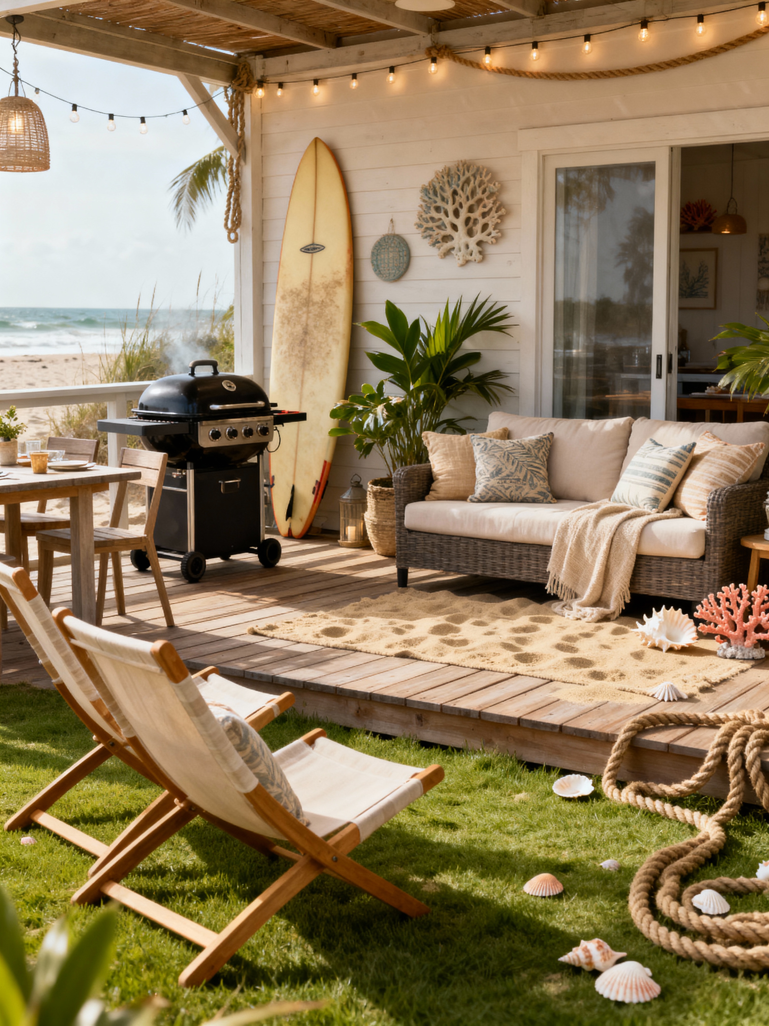 outdoor patio with surf shack style with grass and barbeque or grill and plant and deck with deck chairs and patio couch with pillows and grass. . with surfboard decor and coral accents and seashells and beach vibes and sand-colored textiles and casual dining and rope details and coastal lighting