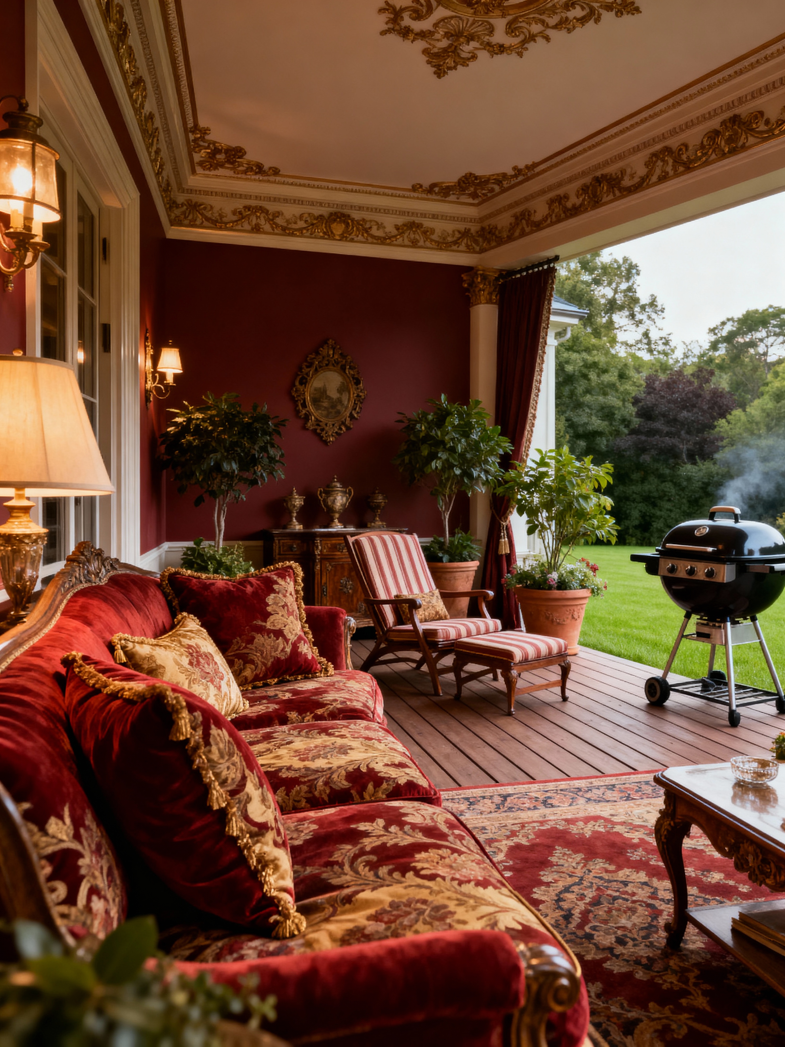 outdoor patio with traditional style with patio couch with pillows and deck with deck chairs and plant and barbeque or grill and grass and patio couch with pillows. . with crown molding and rich fabrics and classic elegance and refined atmosphere and luxurious textiles and antique pieces and ornate details and formal furniture