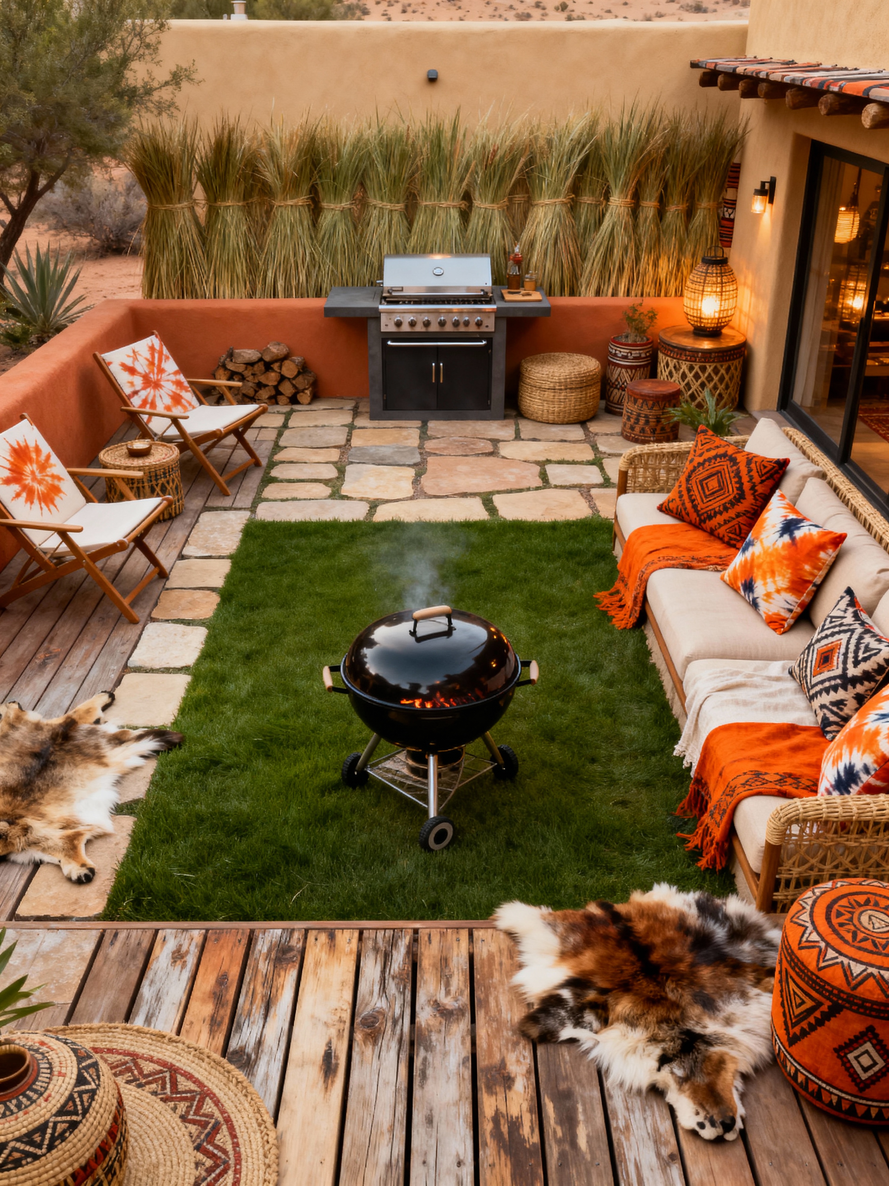 outdoor patio with tribal style with grass and barbeque or grill and plant and patio couch with pillows and deck with deck chairs and grass. . with hand dyed batik fabrics and exuberant splashes of colour and smooth worn timbers and intricate grass weaving and desert colours and animal furslinen and planks of stone and tribal revival