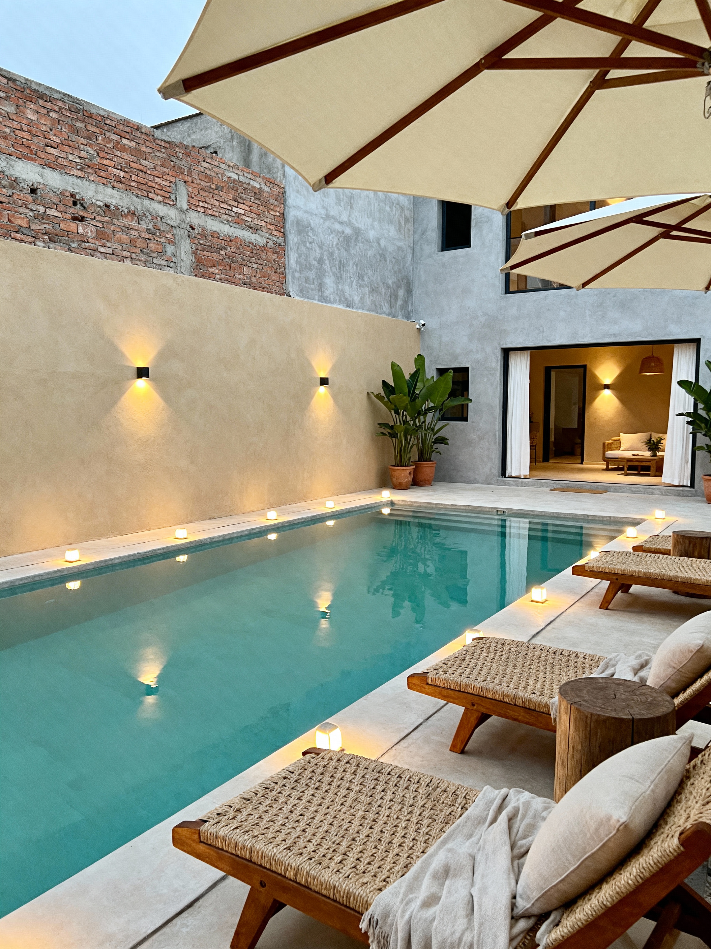 outdoor pool area with airbnb style with pool lounge chairs and pool and pool lights and pool lounge chairs. . with open and natural lighting and practicality and functionality and neutral walls and textures and simple color palette and simple, clean lines and simplistic furniture and natural materials and elements and scandinavian style and open and natural lighting