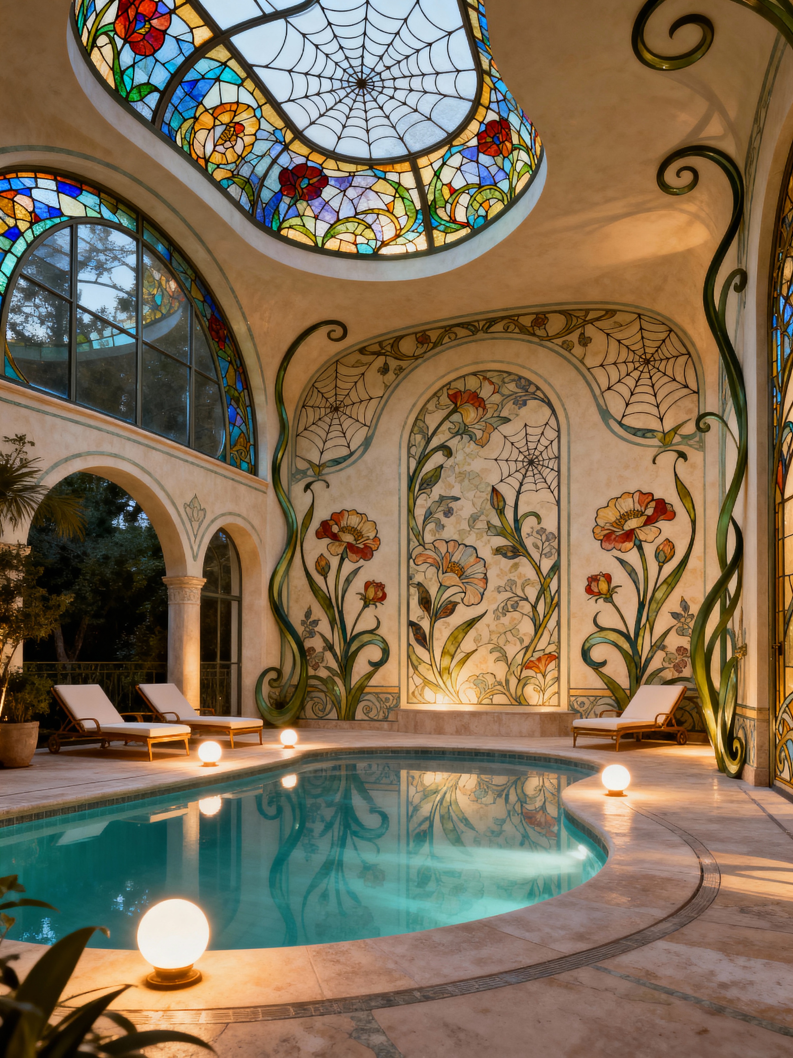 outdoor pool area with art nouveau style with pool and pool lights and pool lounge chairs and pool. . with asymmetrical shapes and stained glass and arches and curved forms and wallpaper patterns of stylized flowers and stained glass and wallpaper pattners of spider webs and curved glass and curving, plant-like embellishments