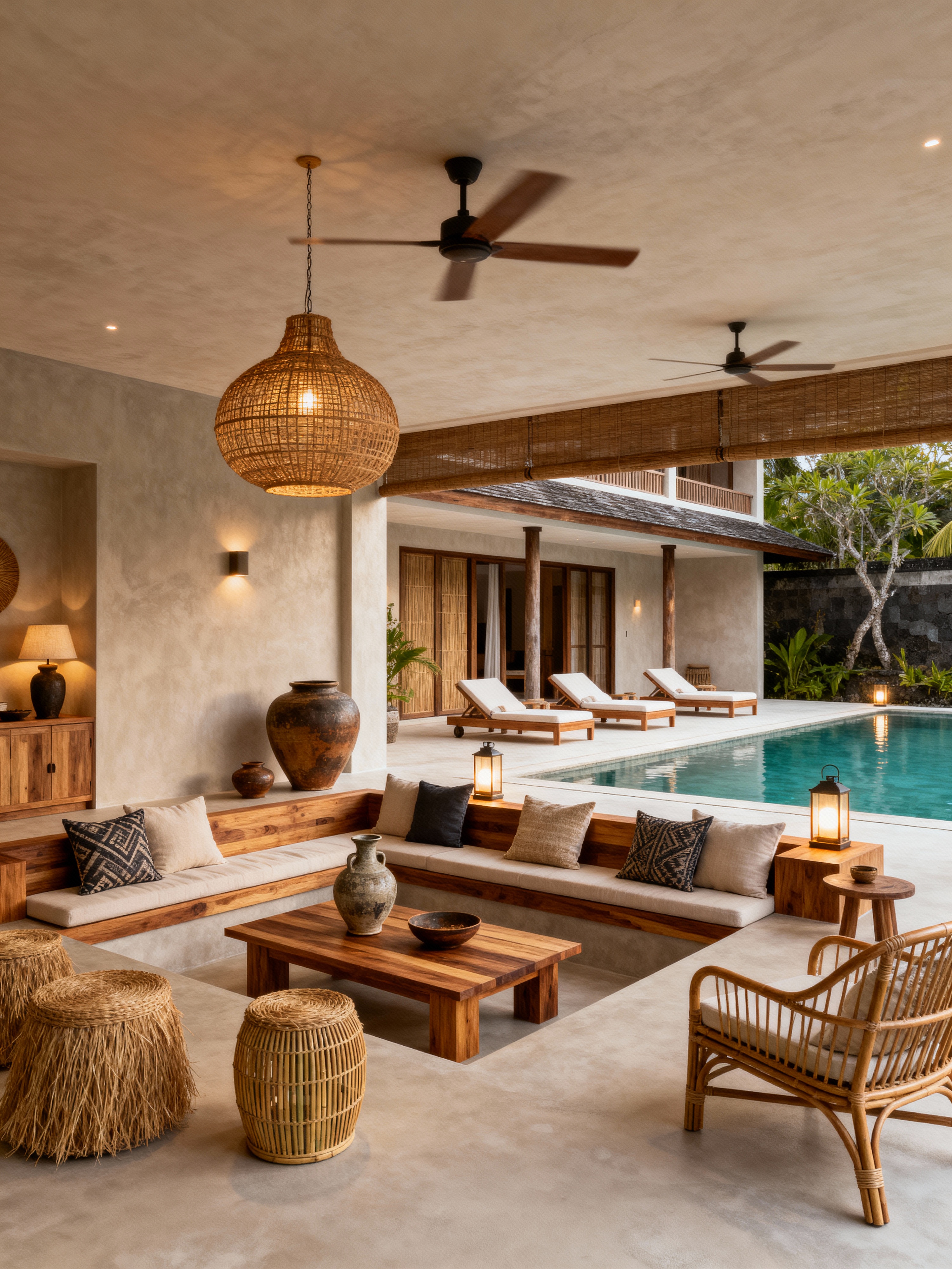 outdoor pool area with bali style with pool lounge chairs and pool lights and pool and pool lounge chairs. . with light wood furniture (teak, oak) and conversation pit with pillows and handcrafted pottery and vases and woven pendant lamps and rattan chairs and decor and raffia or bamboo accents and microcement floors and open high ceilings with fans