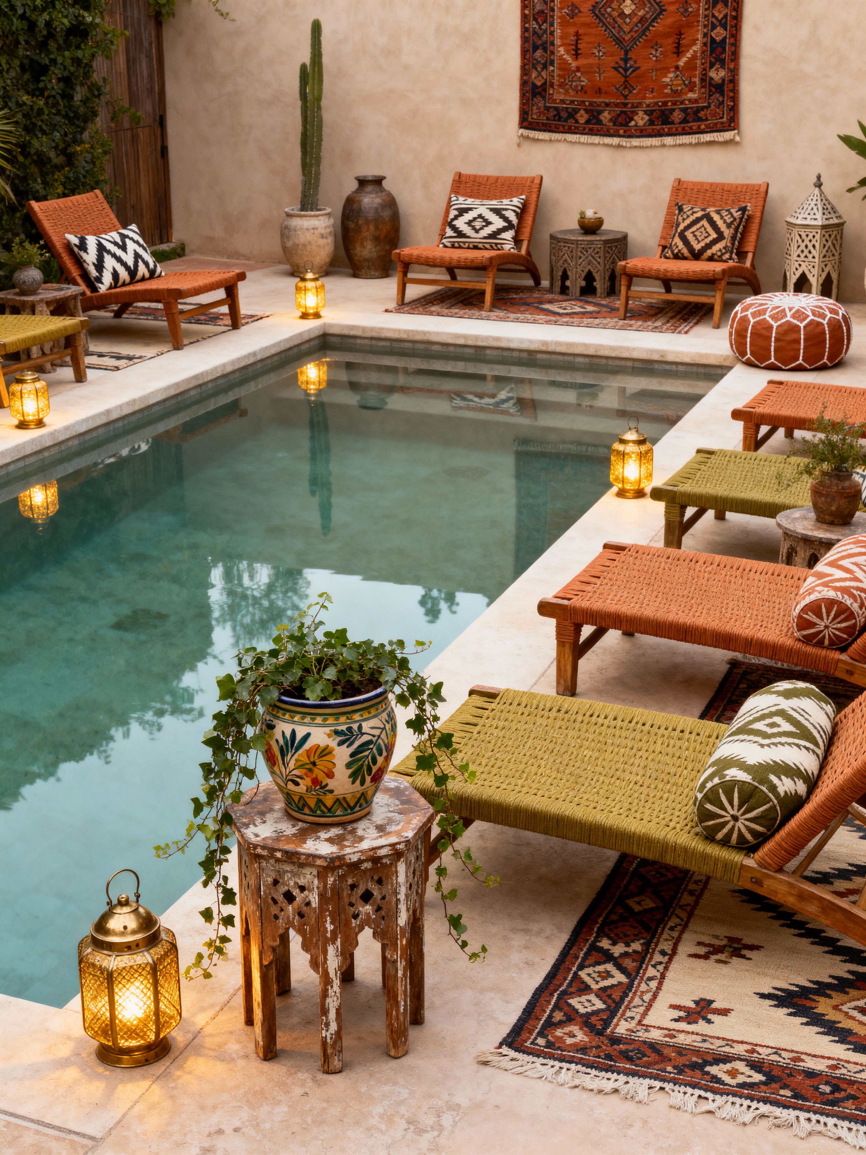 outdoor pool area with boho-chic style with pool lounge chairs and pool and pool lights and pool lounge chairs. . with earthy colors and artistic touches and vintage finds and bohemian flair and mixed patterns and relaxed atmosphere and global artifacts and free-spirited