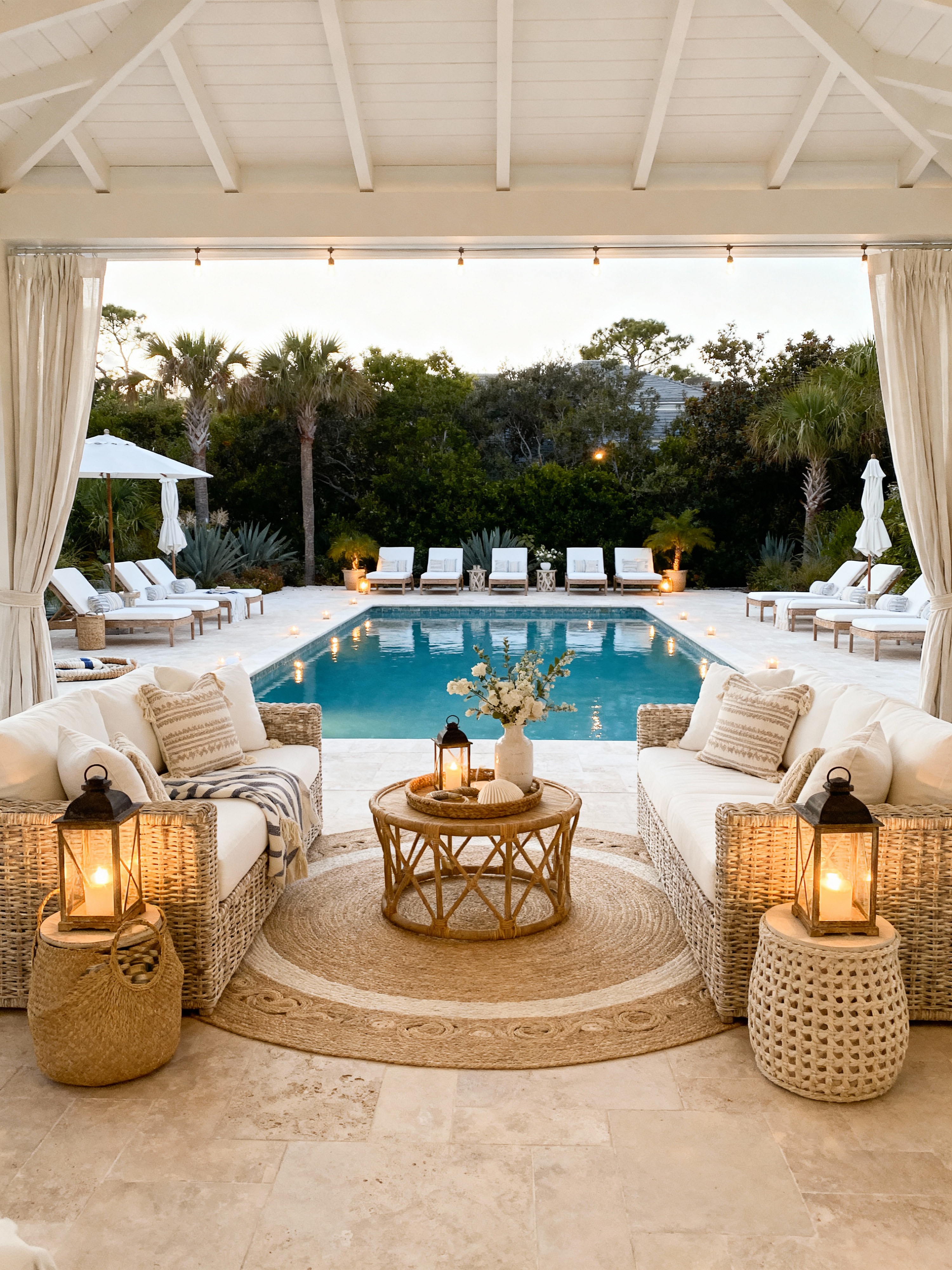 outdoor pool area with coastal style with pool lights and pool lounge chairs and pool and pool lights. . with sand tones and white decor and beach vibes and seaside colors and nautical decor and relaxed style and airy feel and wicker furniture