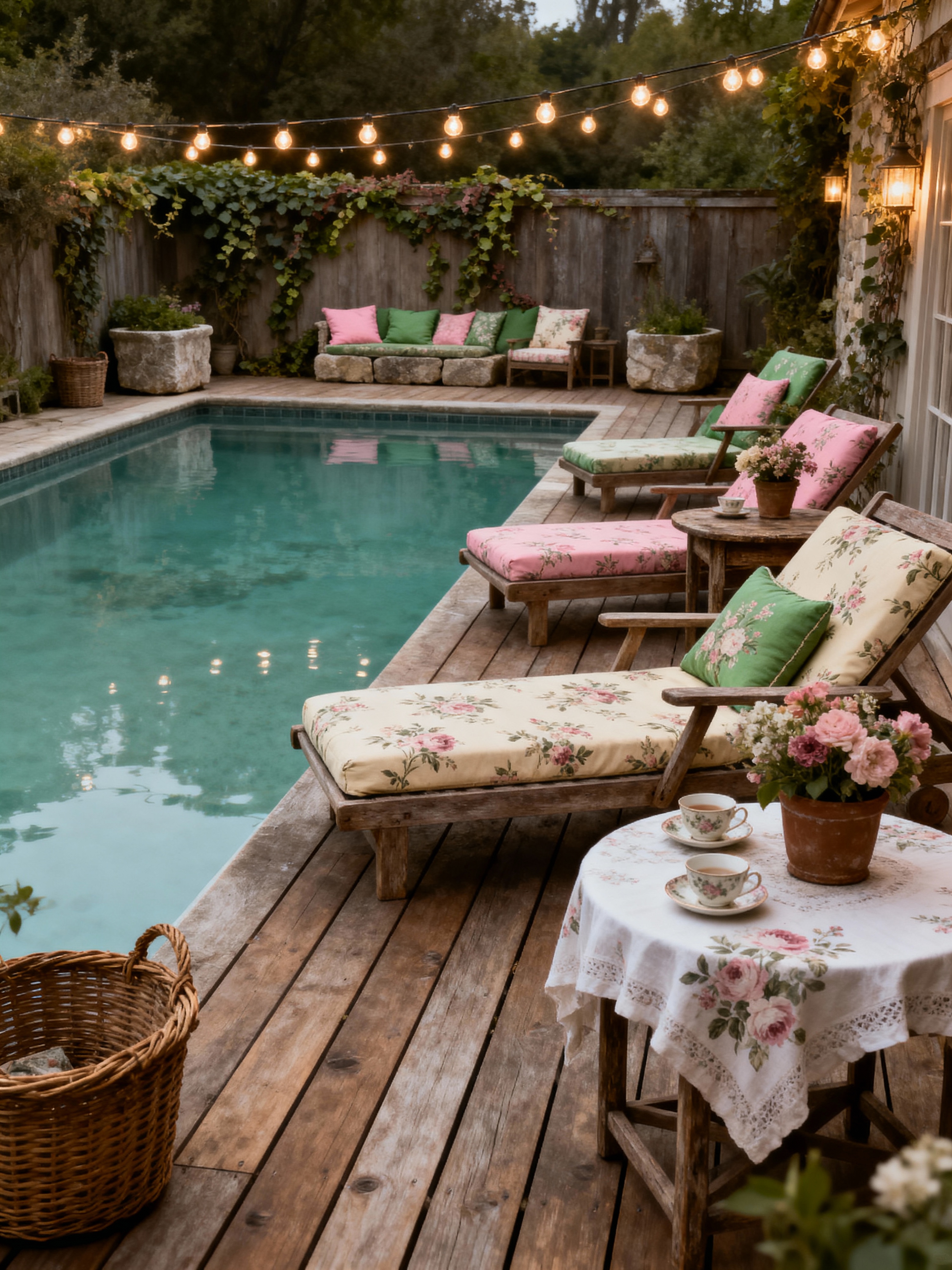 outdoor pool area with cottagecore style with pool lounge chairs and pool and pool lights and pool lounge chairs. . with traditional and organic and muted colors and rustic and floral patterns and country style and cottage style and natural