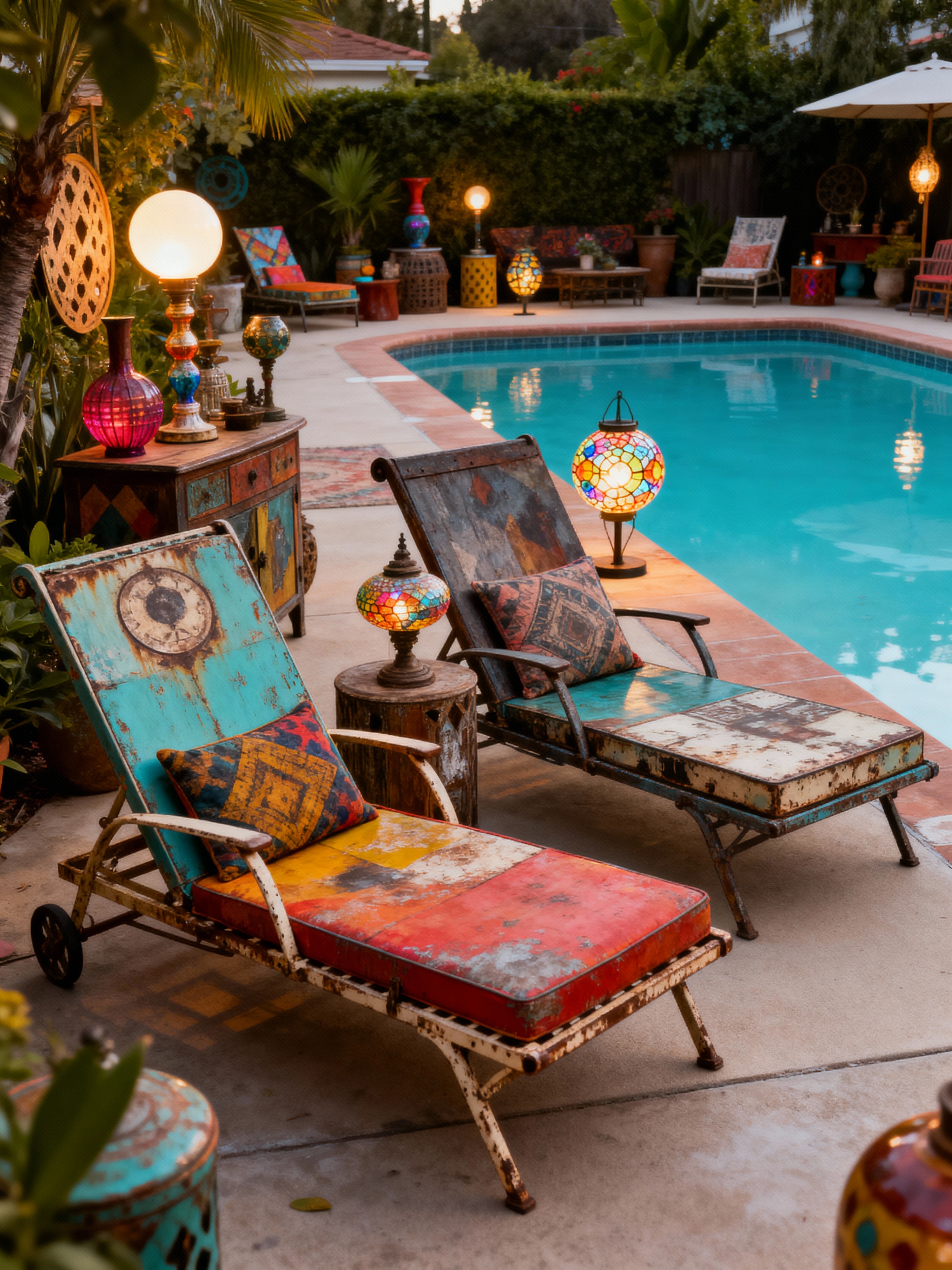 outdoor pool area with eclectic style with pool lounge chairs and pool lights and pool and pool lounge chairs. . with vintage finds and unexpected elements and layered textures and mixed styles and bold combinations and artistic flair and personal expression and unique pieces