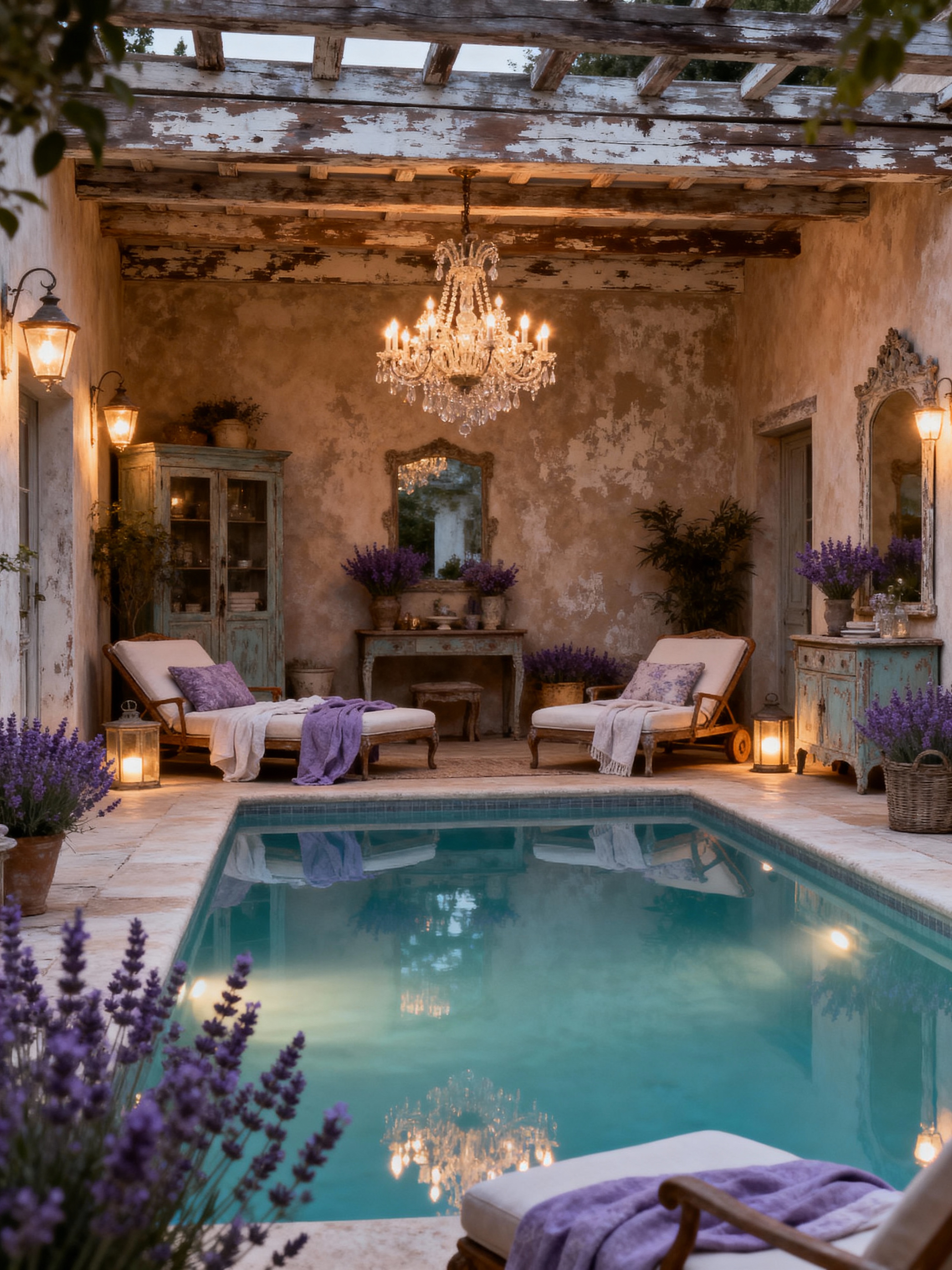 outdoor pool area with french country style with pool lights and pool and pool lounge chairs and pool lights. . with warm tones and chandeliers and lavender accents and vintage furniture and textured walls and soft fabrics and elegant rustic and distressed wood