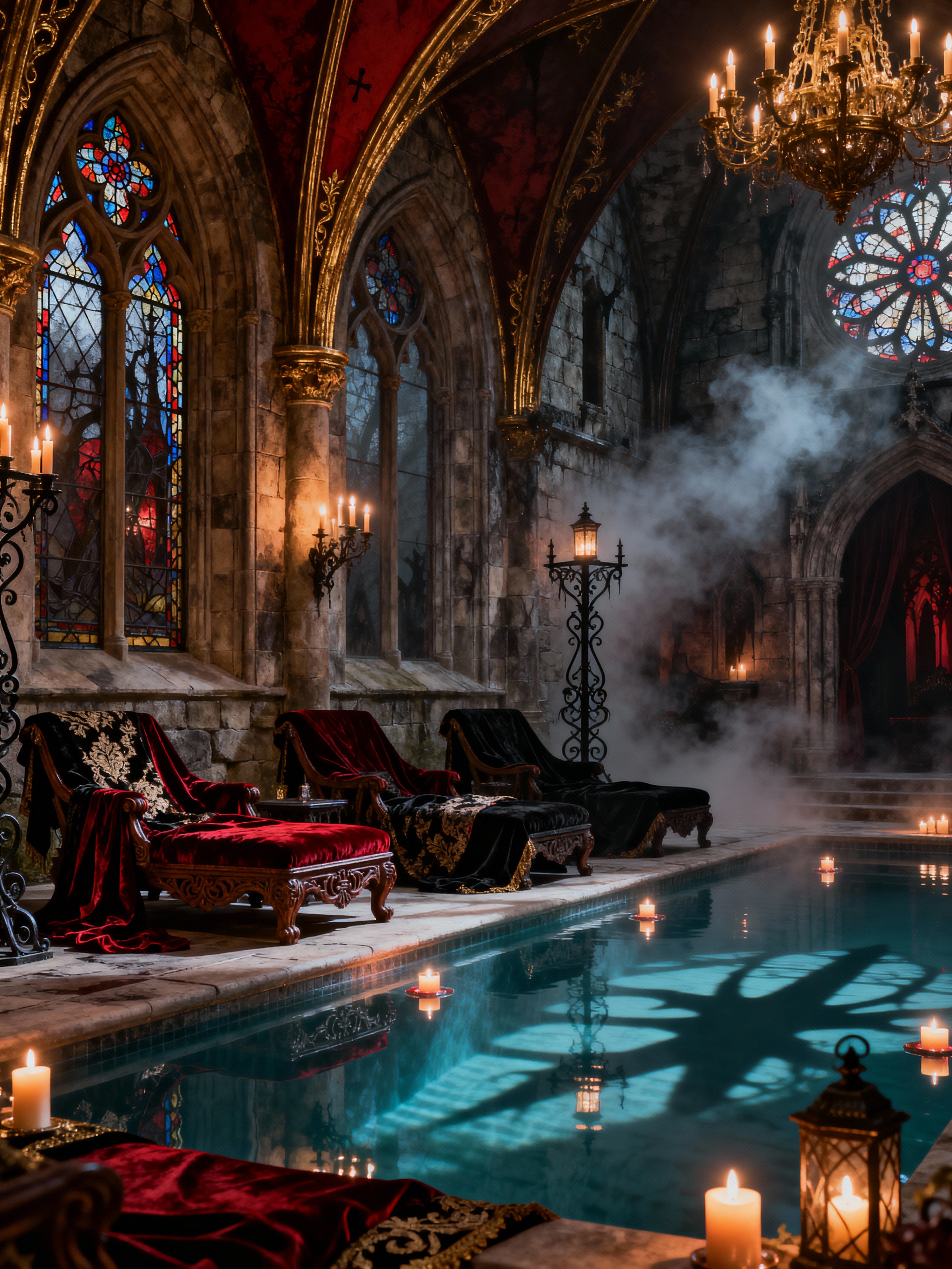 outdoor pool area with gothic style with pool and pool lights and pool lounge chairs and pool. . with arched windows and mysterious mood and ornate details and dramatic atmosphere and rich fabrics and candlelit ambiance and cathedral style and medieval influence
