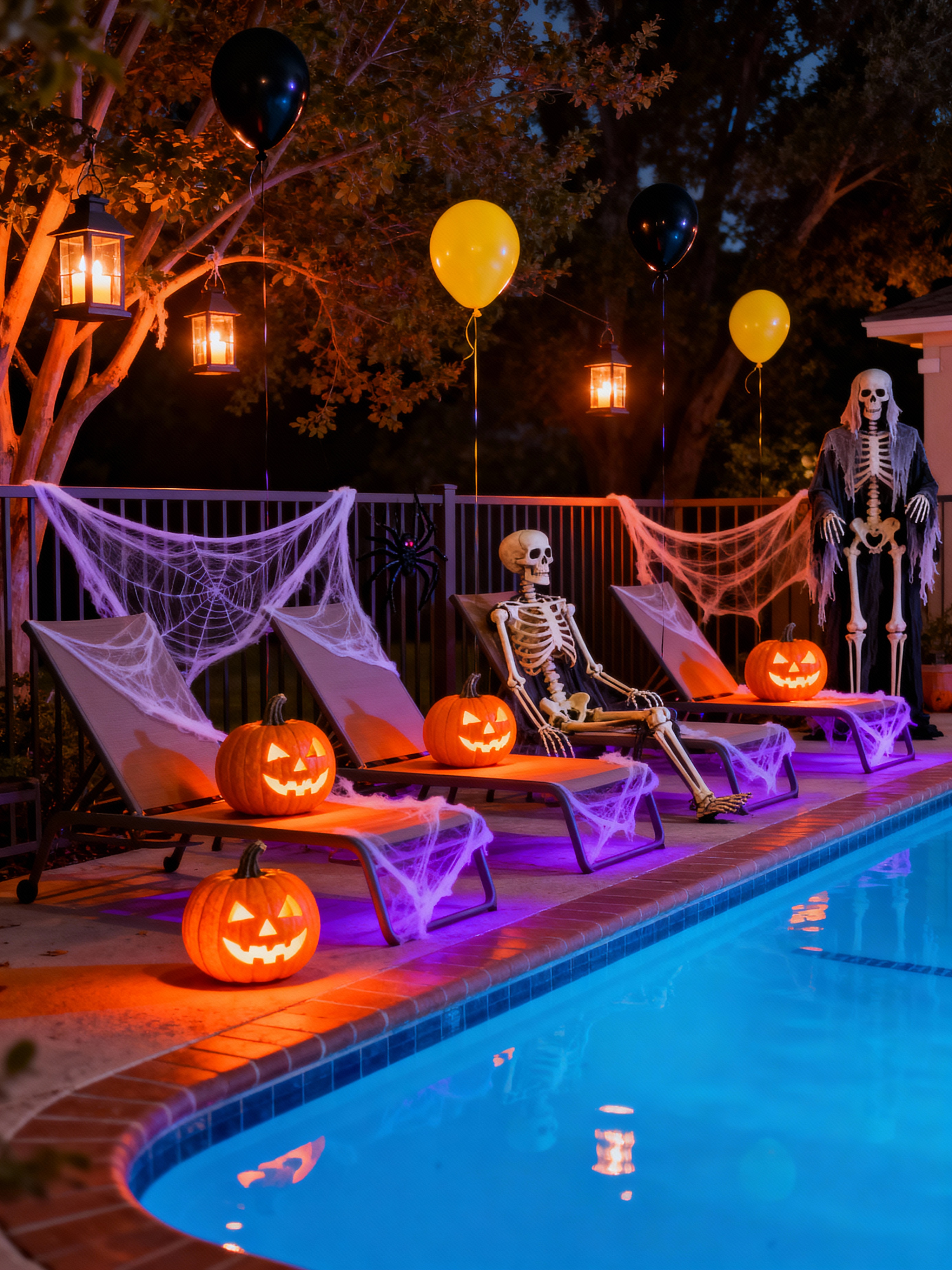 outdoor pool area with halloween style with pool lounge chairs and pool lights and pool and pool lounge chairs. . with spiderwebs and skeletons sitting and standing and glowing pumpkins and cobwebs and cobwebs and lanterns and yellow black balloons and lanterns