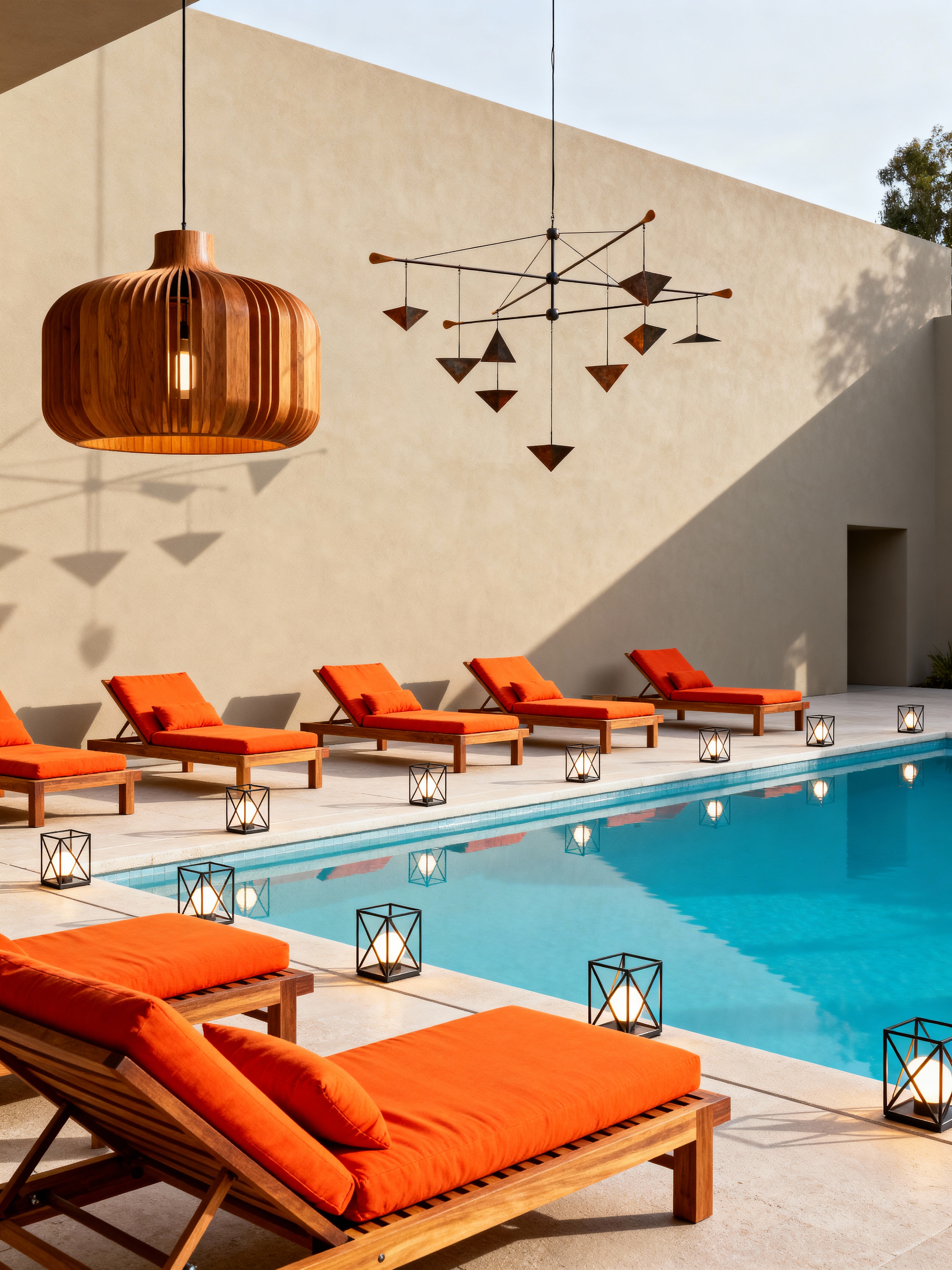 outdoor pool area with midcentury modern style with pool and pool lounge chairs and pool lights and pool. . with function over form and organic and geometric shapes and graphic shapes and wood pendant light mid century modern chandelier and mid century modern mobile chandelier and clean lines and natural and manmade materials and vibrant colors