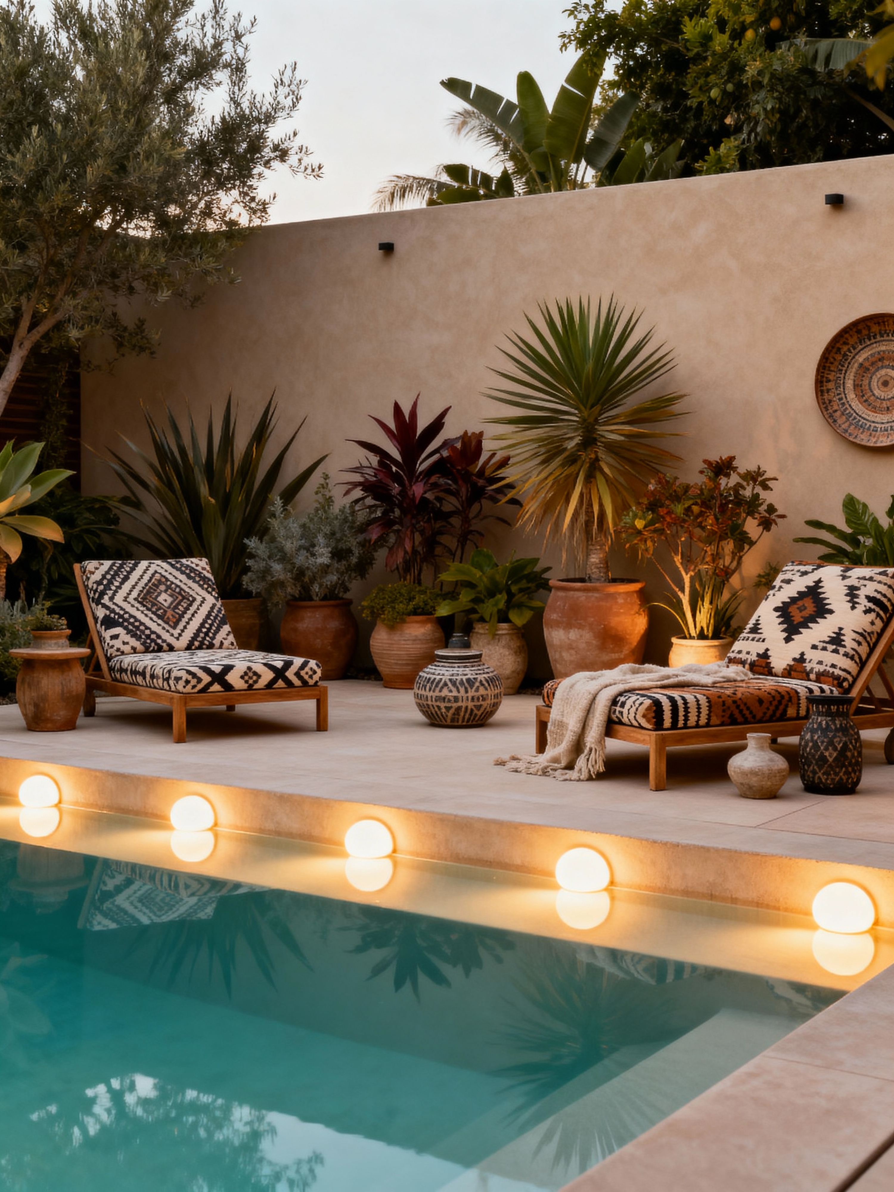 outdoor pool area with modern boho style with pool and pool lights and pool lounge chairs and pool. . with minimalist and layered textures and potted plants and collected look and artistic decor and expressive decor and warm colors and eclectic style