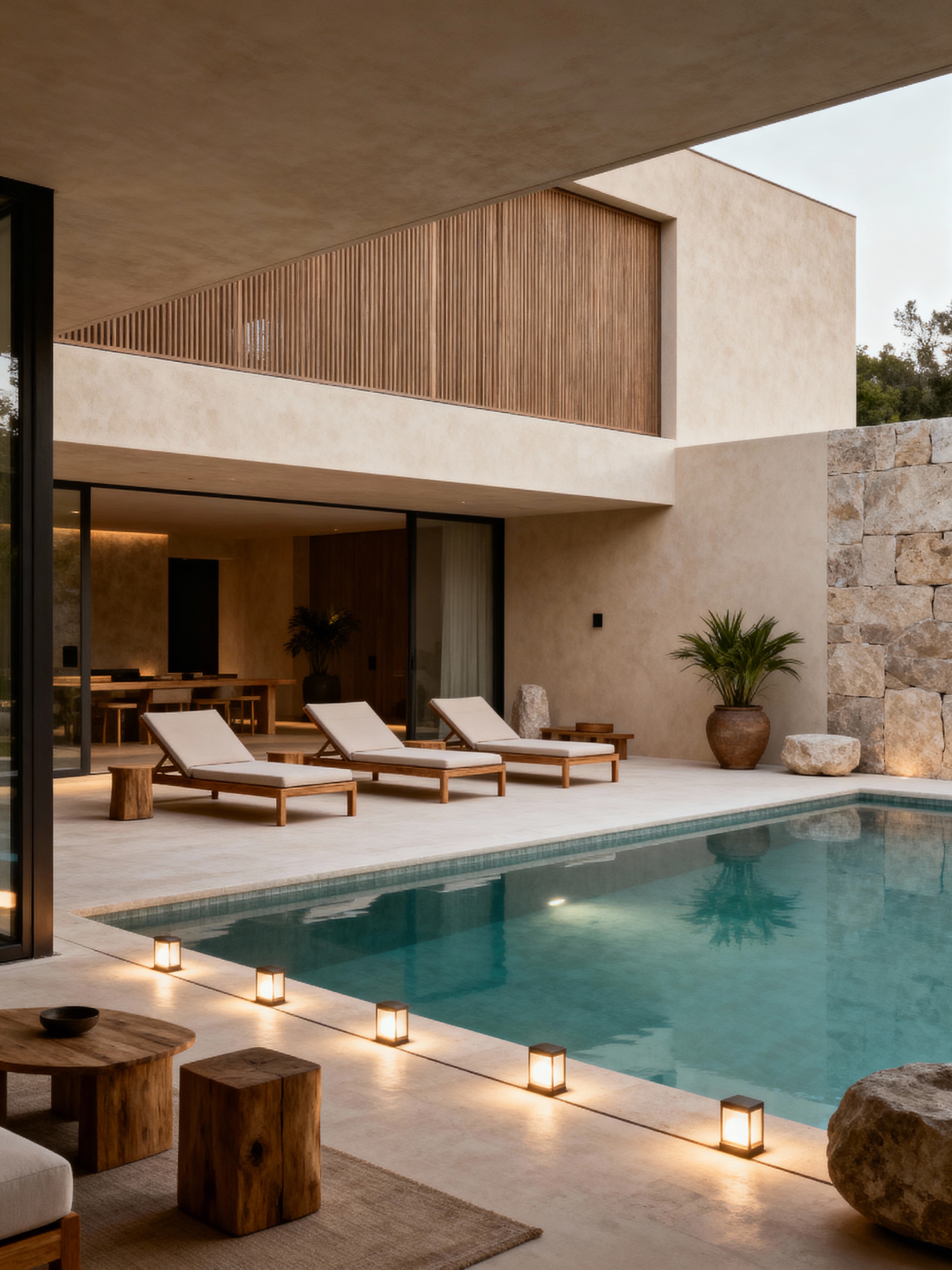 outdoor pool area with modern style with pool lounge chairs and pool lights and pool and pool lounge chairs. . with open and natural lighting and practicality and functionality and natural materials and elements and neutral walls and textures and simple, clean lines and simplistic furniture and open and natural lighting