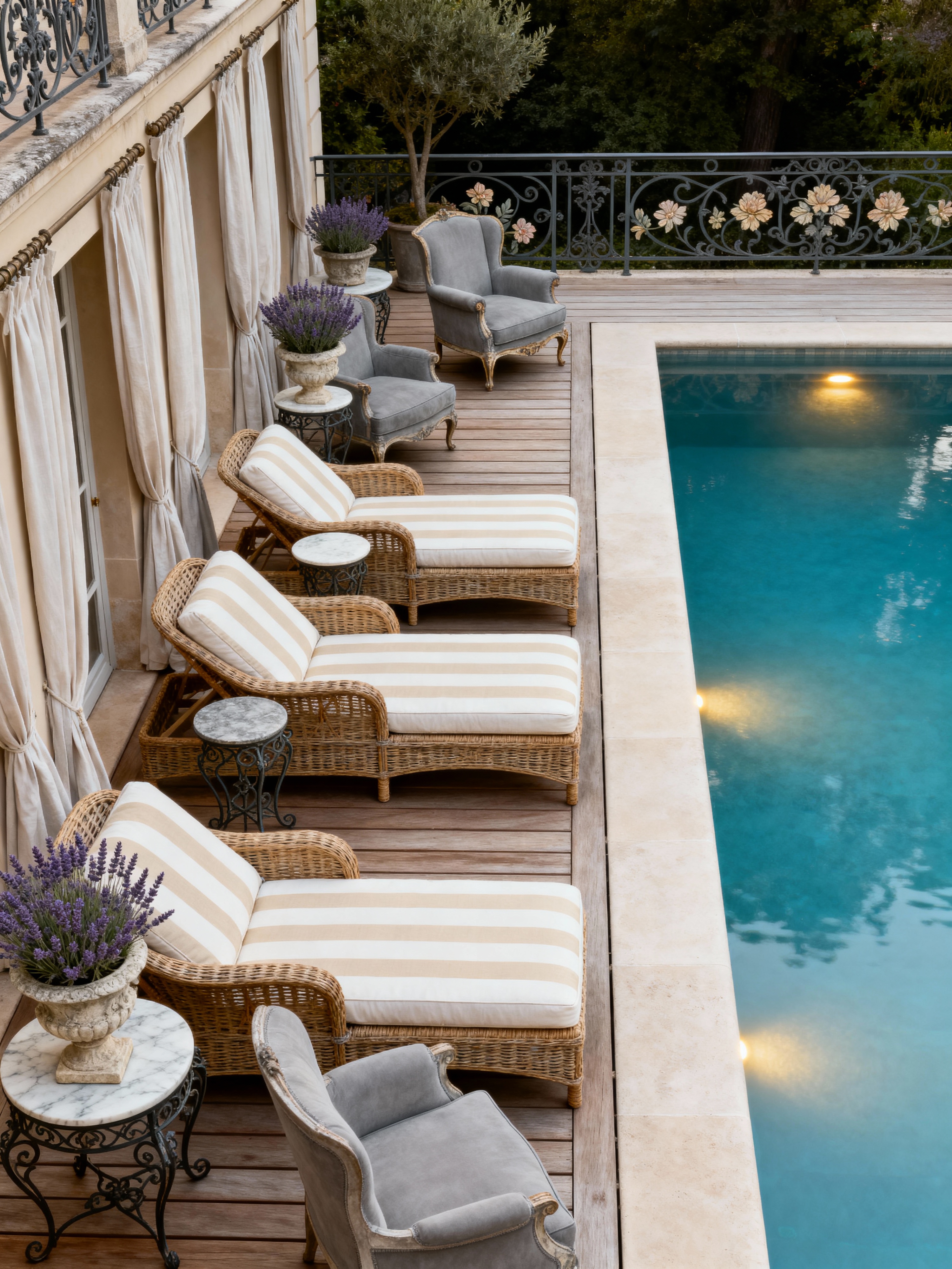 outdoor pool area with parisian style with pool and pool lights and pool lounge chairs and pool. . with vintage pieces and french elegance and refined style and classic details and european flair and timeless beauty and chic simplicity and neutral palette