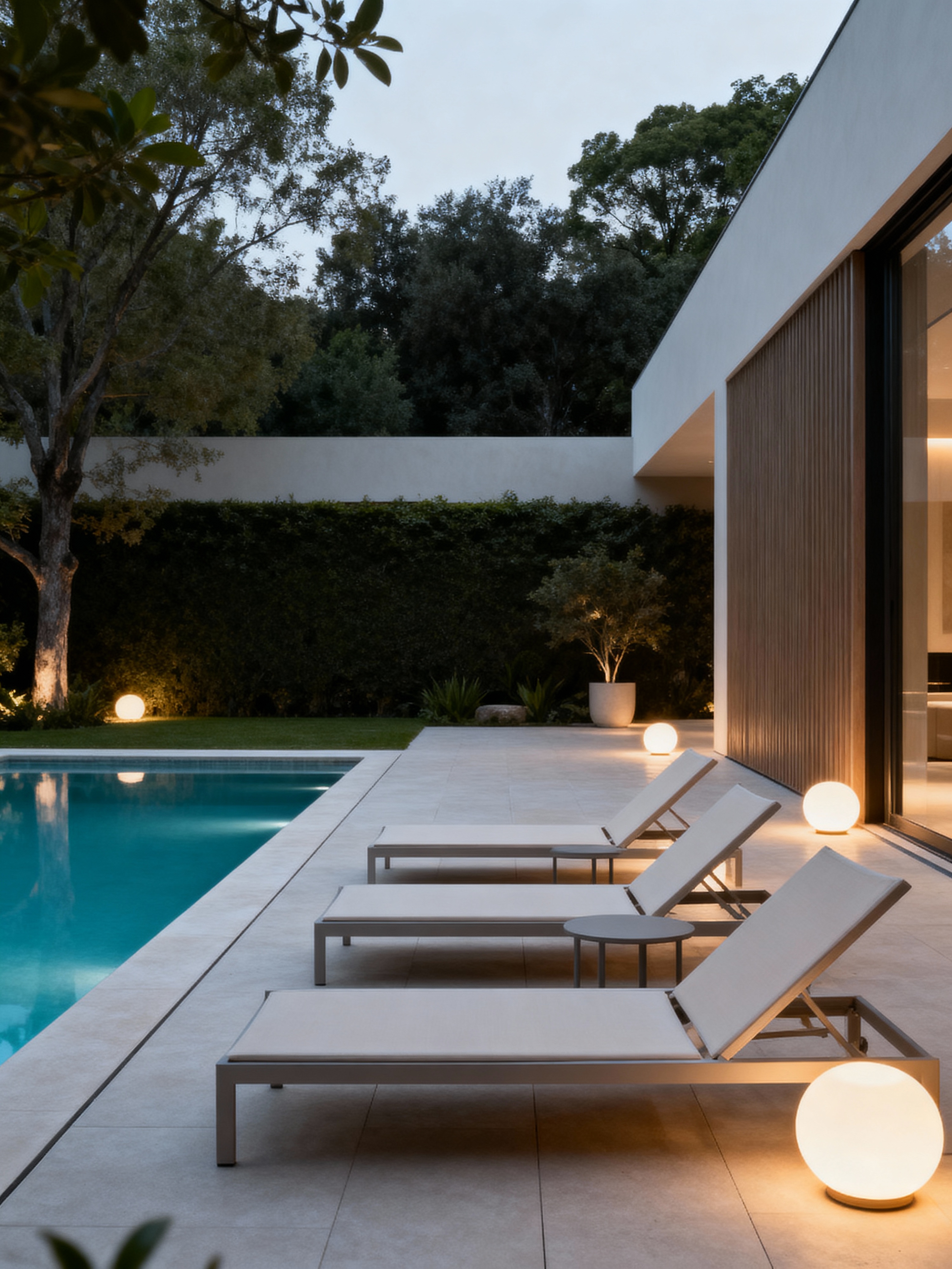 outdoor pool area with simple style with pool lights and pool lounge chairs and pool and pool lights. . with clean design and essential pieces and understated style and pure simplicity and uncluttered space and neutral colors and functional furniture and basic elements