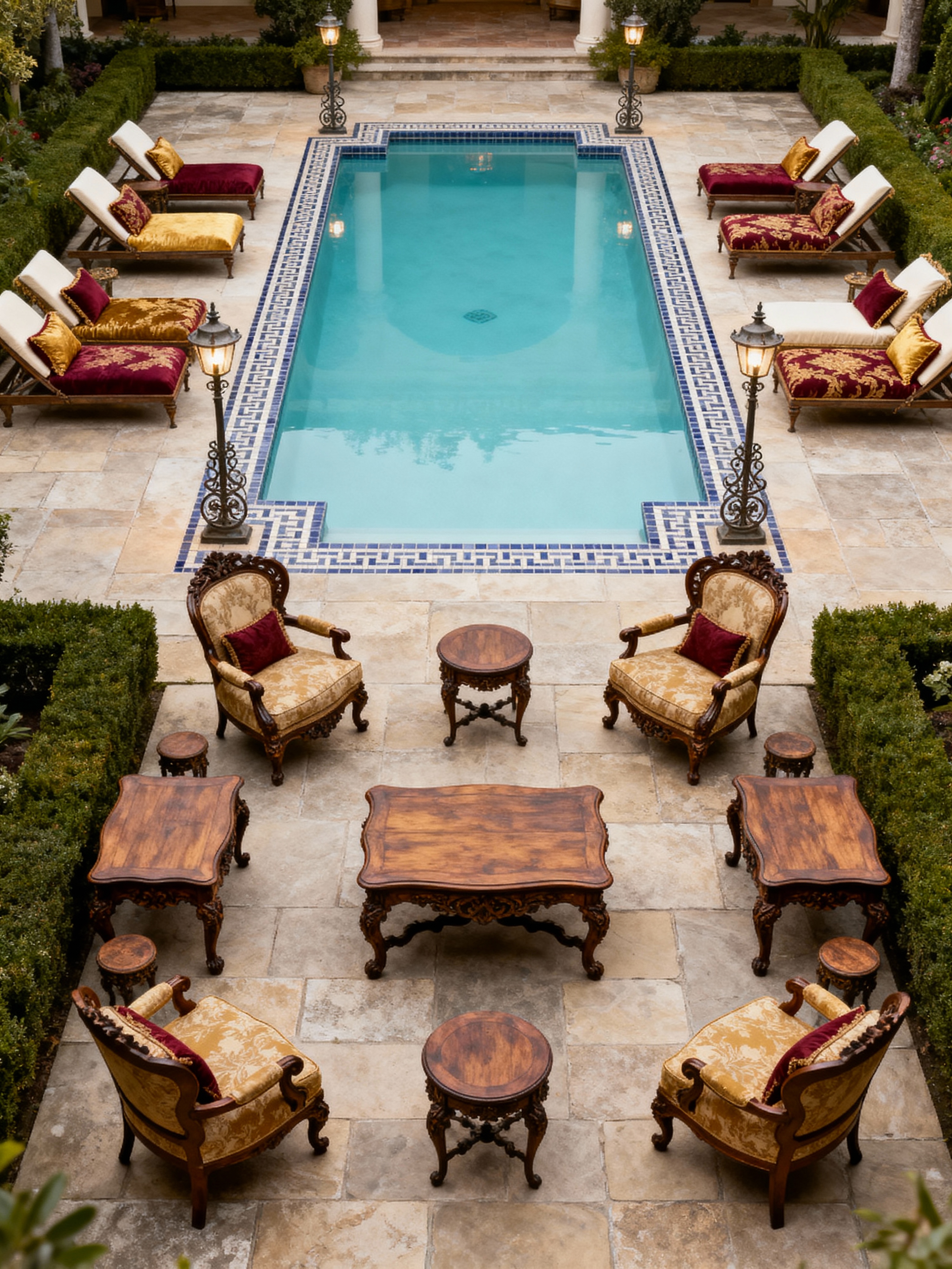 outdoor pool area with traditional style with pool and pool lounge chairs and pool lights and pool. . with formal furniture and timeless design and rich fabrics and warm colors and classic elegance and antique pieces and symmetrical layout and refined atmosphere