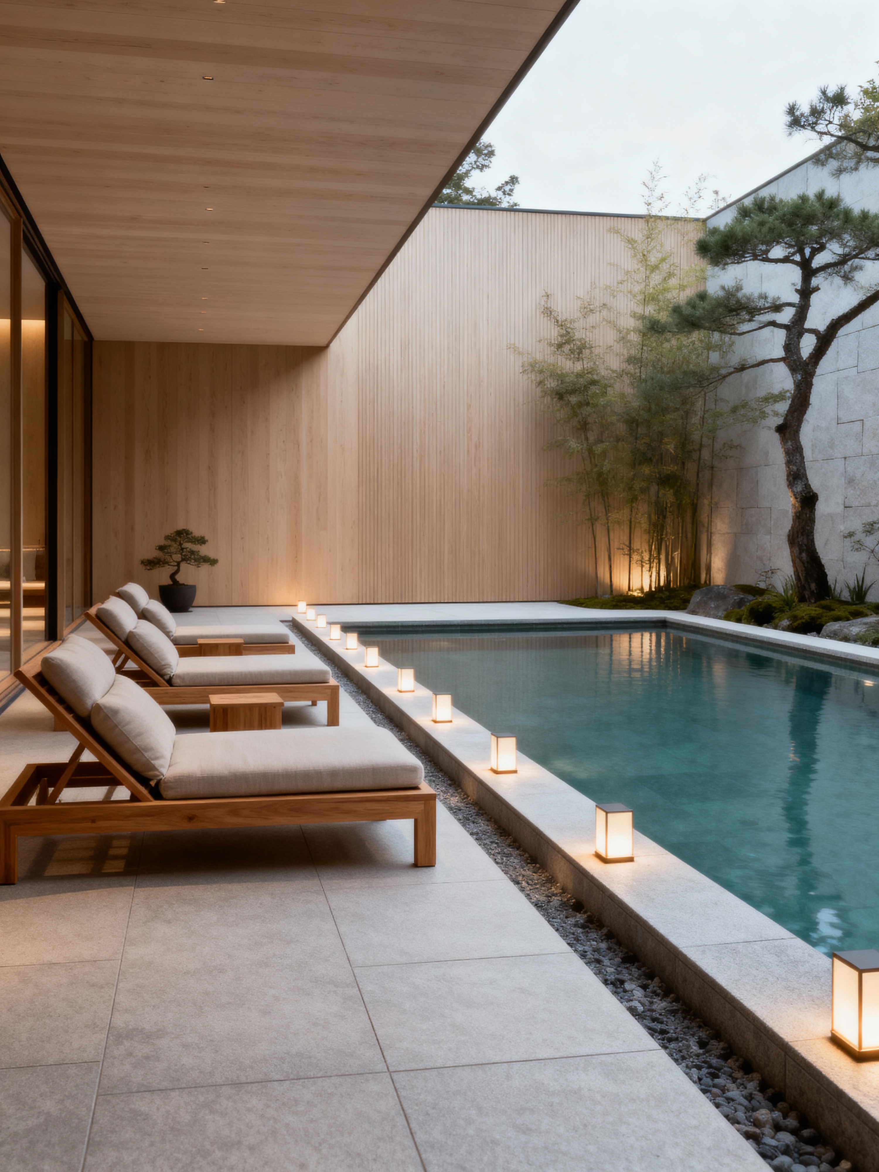 outdoor pool area with zen style with pool and pool lounge chairs and pool lights and pool. . with natural light and clean lines and japanese minimalist and japanese minimalist and mimimalist and clutter free and serenity and harmony and japanese minimalist