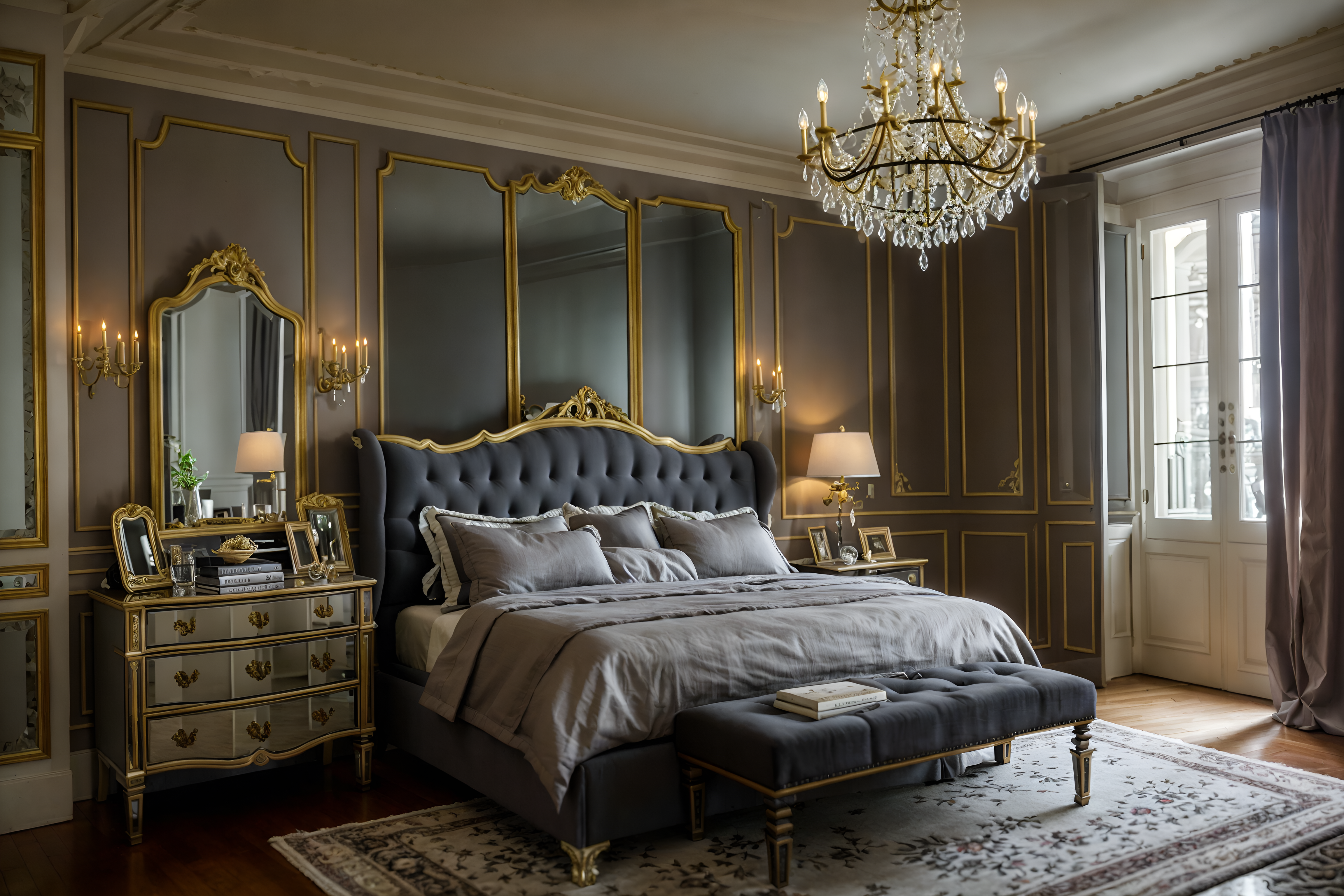 photo from pinterest of parisian-style interior designed (bedroom interior) with storage bench or ottoman and headboard and dresser closet and mirror and accent chair and bedside table or night stand and plant and night light cinematic photo, highly detailed, cinematic lighting, ultra-detailed, ultrarealistic, photorealism, 8k. trending on pinterest. parisian interior design style. masterpiece, cinematic light, ultrarealistic+, photorealistic+, 8k, raw photo, realistic, sharp focus on eyes, (symmetrical eyes), (intact eyes), hyperrealistic, highest quality, best quality, , highly detailed, masterpiece, best quality, extremely detailed 8k wallpaper, masterpiece, best quality, ultra-detailed, best shadow, detailed background, detailed face, detailed eyes, high contrast, best illumination, detailed face, dulux, caustic, dynamic angle, detailed glow. dramatic lighting. highly detailed, insanely detailed hair, symmetrical, intricate details, professionally retouched, 8k high definition. strong bokeh. award winning photo.