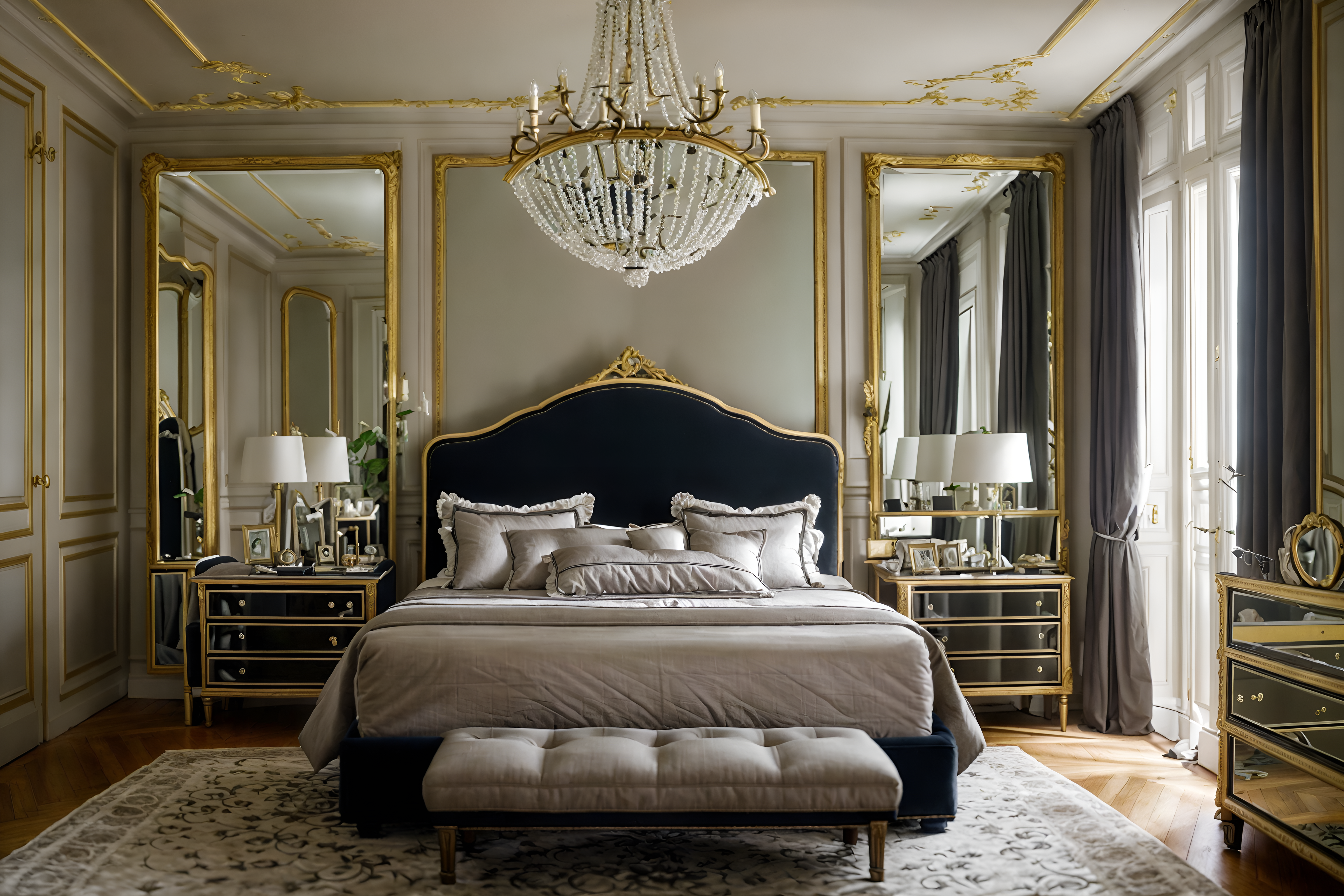 photo from pinterest of parisian-style interior designed (bedroom interior) with storage bench or ottoman and headboard and dresser closet and mirror and accent chair and bedside table or night stand and plant and night light cinematic photo, highly detailed, cinematic lighting, ultra-detailed, ultrarealistic, photorealism, 8k. trending on pinterest. parisian interior design style. masterpiece, cinematic light, ultrarealistic+, photorealistic+, 8k, raw photo, realistic, sharp focus on eyes, (symmetrical eyes), (intact eyes), hyperrealistic, highest quality, best quality, , highly detailed, masterpiece, best quality, extremely detailed 8k wallpaper, masterpiece, best quality, ultra-detailed, best shadow, detailed background, detailed face, detailed eyes, high contrast, best illumination, detailed face, dulux, caustic, dynamic angle, detailed glow. dramatic lighting. highly detailed, insanely detailed hair, symmetrical, intricate details, professionally retouched, 8k high definition. strong bokeh. award winning photo.