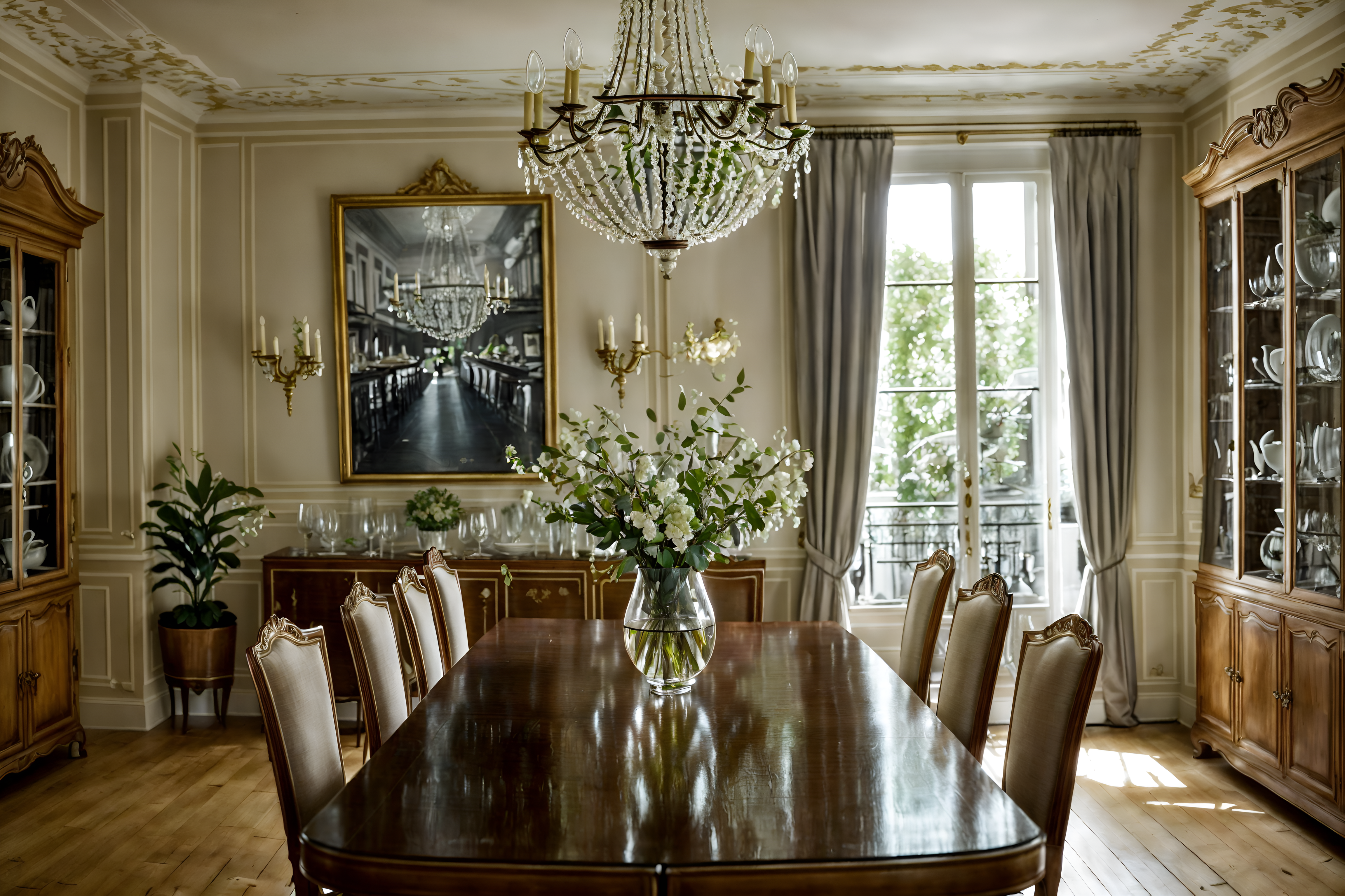 photo from pinterest of parisian-style interior designed (dining room interior) with painting or photo on wall and plant and dining table chairs and light or chandelier and vase and plates, cutlery and glasses on dining table and dining table and bookshelves cinematic photo, highly detailed, cinematic lighting, ultra-detailed, ultrarealistic, photorealism, 8k. trending on pinterest. parisian interior design style. masterpiece, cinematic light, ultrarealistic+, photorealistic+, 8k, raw photo, realistic, sharp focus on eyes, (symmetrical eyes), (intact eyes), hyperrealistic, highest quality, best quality, , highly detailed, masterpiece, best quality, extremely detailed 8k wallpaper, masterpiece, best quality, ultra-detailed, best shadow, detailed background, detailed face, detailed eyes, high contrast, best illumination, detailed face, dulux, caustic, dynamic angle, detailed glow. dramatic lighting. highly detailed, insanely detailed hair, symmetrical, intricate details, professionally retouched, 8k high definition. strong bokeh. award winning photo.
