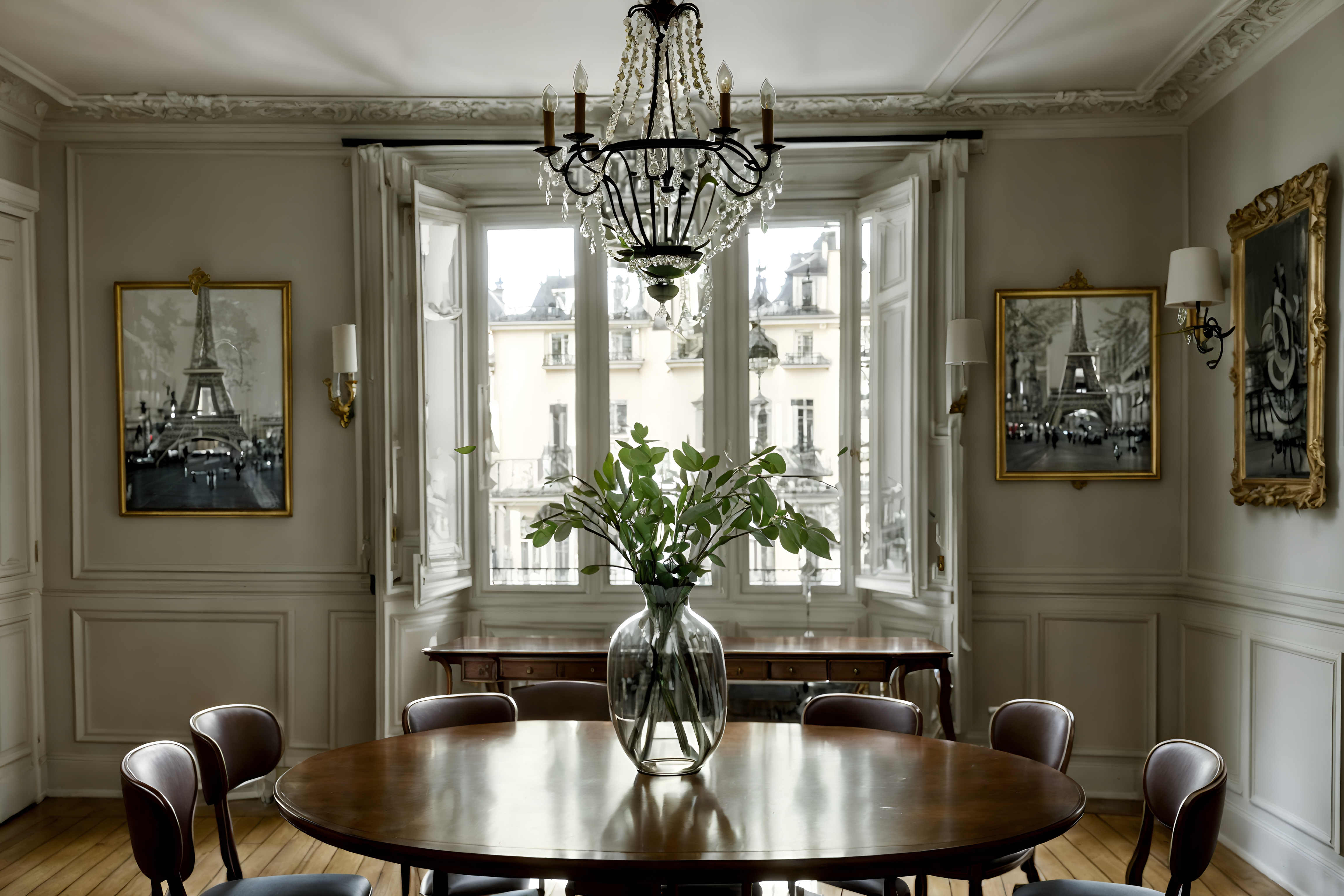 photo from pinterest of parisian-style interior designed (dining room interior) with painting or photo on wall and plant and dining table chairs and light or chandelier and vase and plates, cutlery and glasses on dining table and dining table and bookshelves cinematic photo, highly detailed, cinematic lighting, ultra-detailed, ultrarealistic, photorealism, 8k. trending on pinterest. parisian interior design style. masterpiece, cinematic light, ultrarealistic+, photorealistic+, 8k, raw photo, realistic, sharp focus on eyes, (symmetrical eyes), (intact eyes), hyperrealistic, highest quality, best quality, , highly detailed, masterpiece, best quality, extremely detailed 8k wallpaper, masterpiece, best quality, ultra-detailed, best shadow, detailed background, detailed face, detailed eyes, high contrast, best illumination, detailed face, dulux, caustic, dynamic angle, detailed glow. dramatic lighting. highly detailed, insanely detailed hair, symmetrical, intricate details, professionally retouched, 8k high definition. strong bokeh. award winning photo.