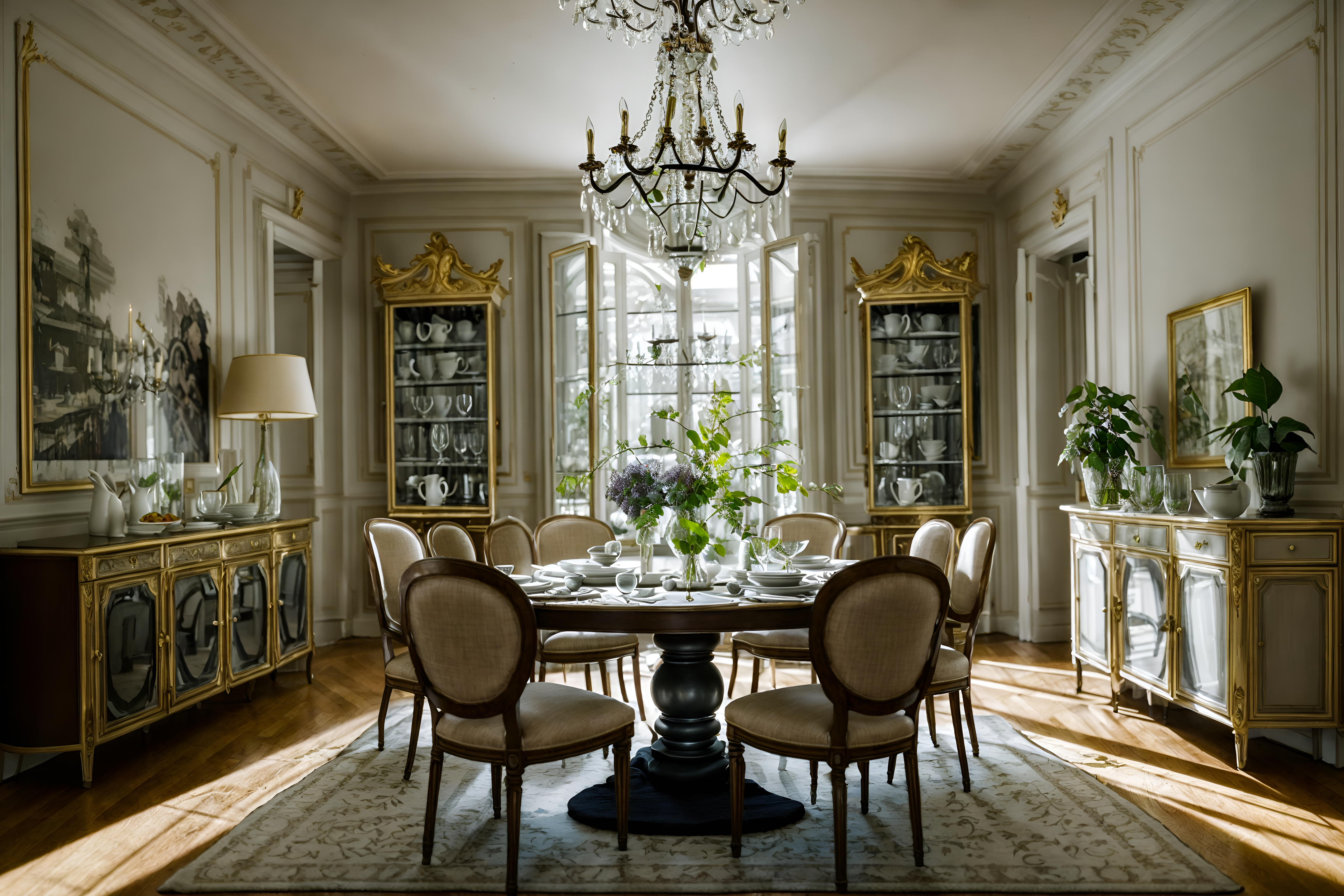 parisian dining roomsinterior decorate this dining room with parisian style. . . with vase and bookshelves and dining table and painting or photo on wall and dining table chairs and table cloth and plates, cutlery and glasses on dining table and light or chandelier. . with classic details and neutral palette and timeless beauty and european flair and vintage pieces and sophisticated charm and antique furniture and ornate moldings. . .