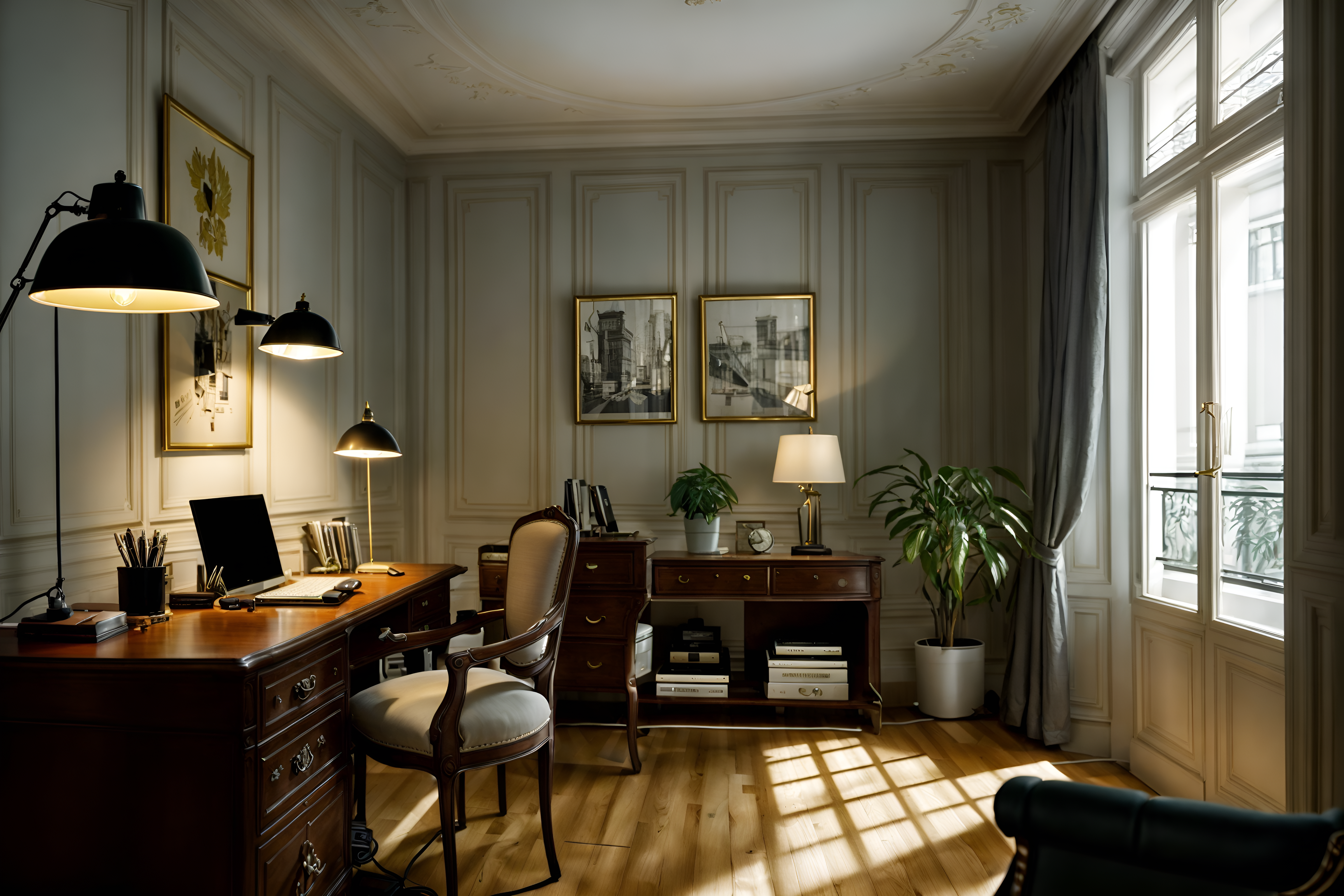 photo from pinterest of parisian-style interior designed (home office interior) with desk lamp and cabinets and office chair and computer desk and plant and desk lamp cinematic photo, highly detailed, cinematic lighting, ultra-detailed, ultrarealistic, photorealism, 8k. trending on pinterest. parisian interior design style. masterpiece, cinematic light, ultrarealistic+, photorealistic+, 8k, raw photo, realistic, sharp focus on eyes, (symmetrical eyes), (intact eyes), hyperrealistic, highest quality, best quality, , highly detailed, masterpiece, best quality, extremely detailed 8k wallpaper, masterpiece, best quality, ultra-detailed, best shadow, detailed background, detailed face, detailed eyes, high contrast, best illumination, detailed face, dulux, caustic, dynamic angle, detailed glow. dramatic lighting. highly detailed, insanely detailed hair, symmetrical, intricate details, professionally retouched, 8k high definition. strong bokeh. award winning photo.