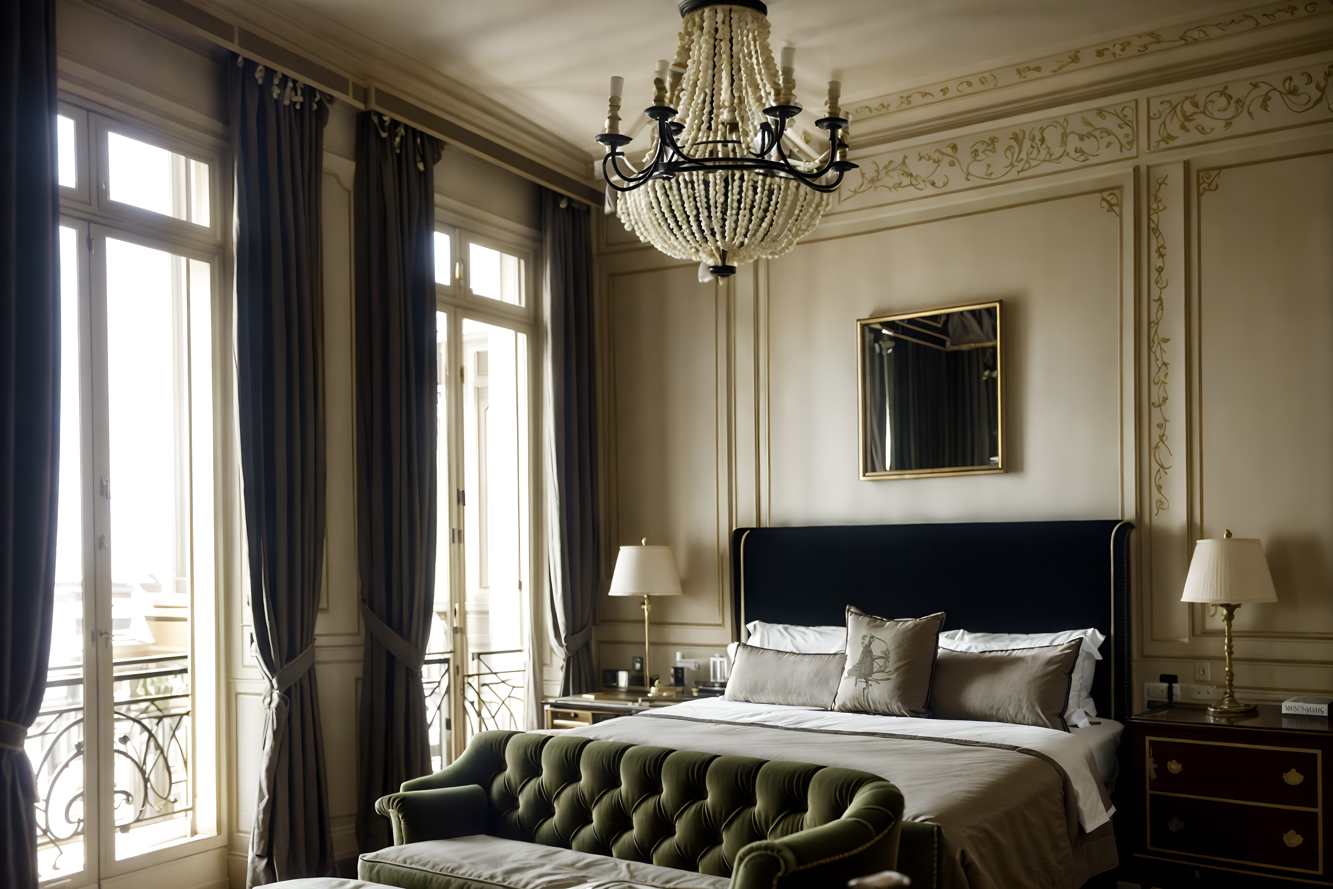 photo from pinterest of parisian-style interior designed (hotel room interior) with night light and plant and storage bench or ottoman and hotel bathroom and headboard and dresser closet and bed and working desk with desk chair cinematic photo, highly detailed, cinematic lighting, ultra-detailed, ultrarealistic, photorealism, 8k. trending on pinterest. parisian interior design style. masterpiece, cinematic light, ultrarealistic+, photorealistic+, 8k, raw photo, realistic, sharp focus on eyes, (symmetrical eyes), (intact eyes), hyperrealistic, highest quality, best quality, , highly detailed, masterpiece, best quality, extremely detailed 8k wallpaper, masterpiece, best quality, ultra-detailed, best shadow, detailed background, detailed face, detailed eyes, high contrast, best illumination, detailed face, dulux, caustic, dynamic angle, detailed glow. dramatic lighting. highly detailed, insanely detailed hair, symmetrical, intricate details, professionally retouched, 8k high definition. strong bokeh. award winning photo.
