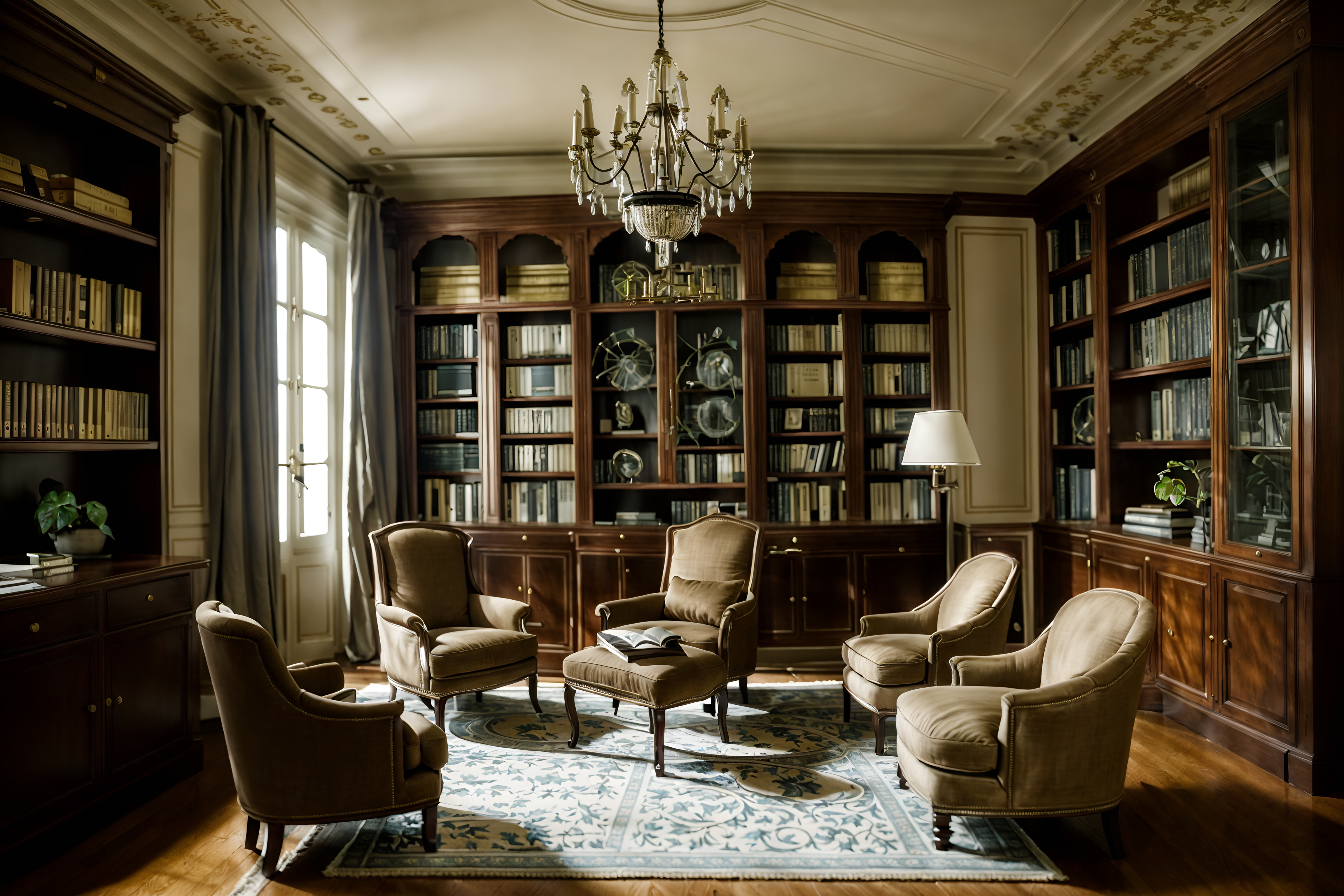 photo from pinterest of parisian-style interior designed (study room interior) with cabinets and lounge chair and desk lamp and office chair and plant and bookshelves and writing desk and cabinets cinematic photo, highly detailed, cinematic lighting, ultra-detailed, ultrarealistic, photorealism, 8k. trending on pinterest. parisian interior design style. masterpiece, cinematic light, ultrarealistic+, photorealistic+, 8k, raw photo, realistic, sharp focus on eyes, (symmetrical eyes), (intact eyes), hyperrealistic, highest quality, best quality, , highly detailed, masterpiece, best quality, extremely detailed 8k wallpaper, masterpiece, best quality, ultra-detailed, best shadow, detailed background, detailed face, detailed eyes, high contrast, best illumination, detailed face, dulux, caustic, dynamic angle, detailed glow. dramatic lighting. highly detailed, insanely detailed hair, symmetrical, intricate details, professionally retouched, 8k high definition. strong bokeh. award winning photo.