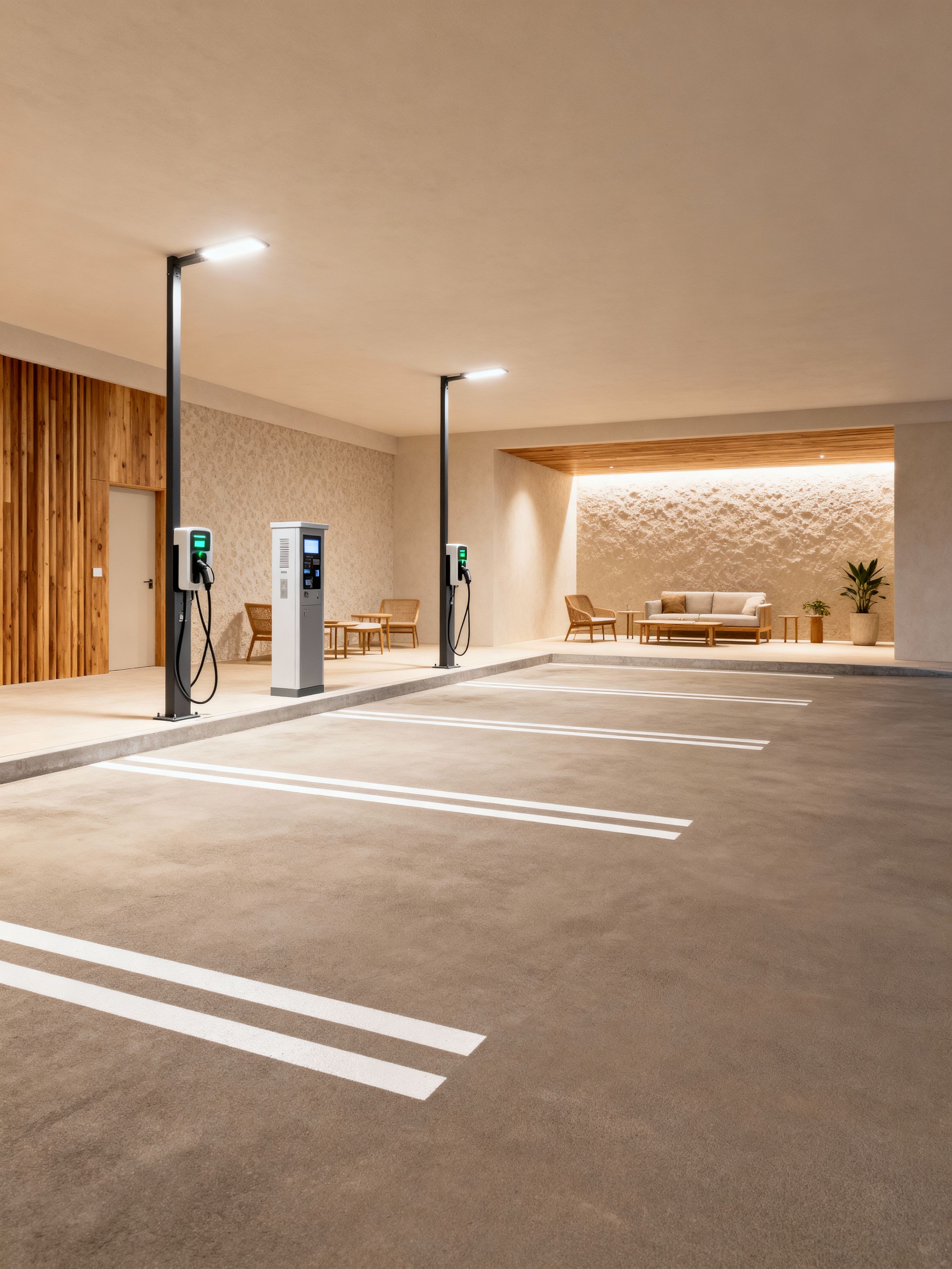parking lot with airbnb style with ev charging stations and lighting poles and parking lot and drive lanes and markings and white parking lot stripes and payment kiosks and parking lot. . with open and natural lighting and natural materials and elements and neutral walls and textures and simple, clean lines and simplistic furniture and scandinavian style and practicality and functionality and simple color palette and open and natural lighting