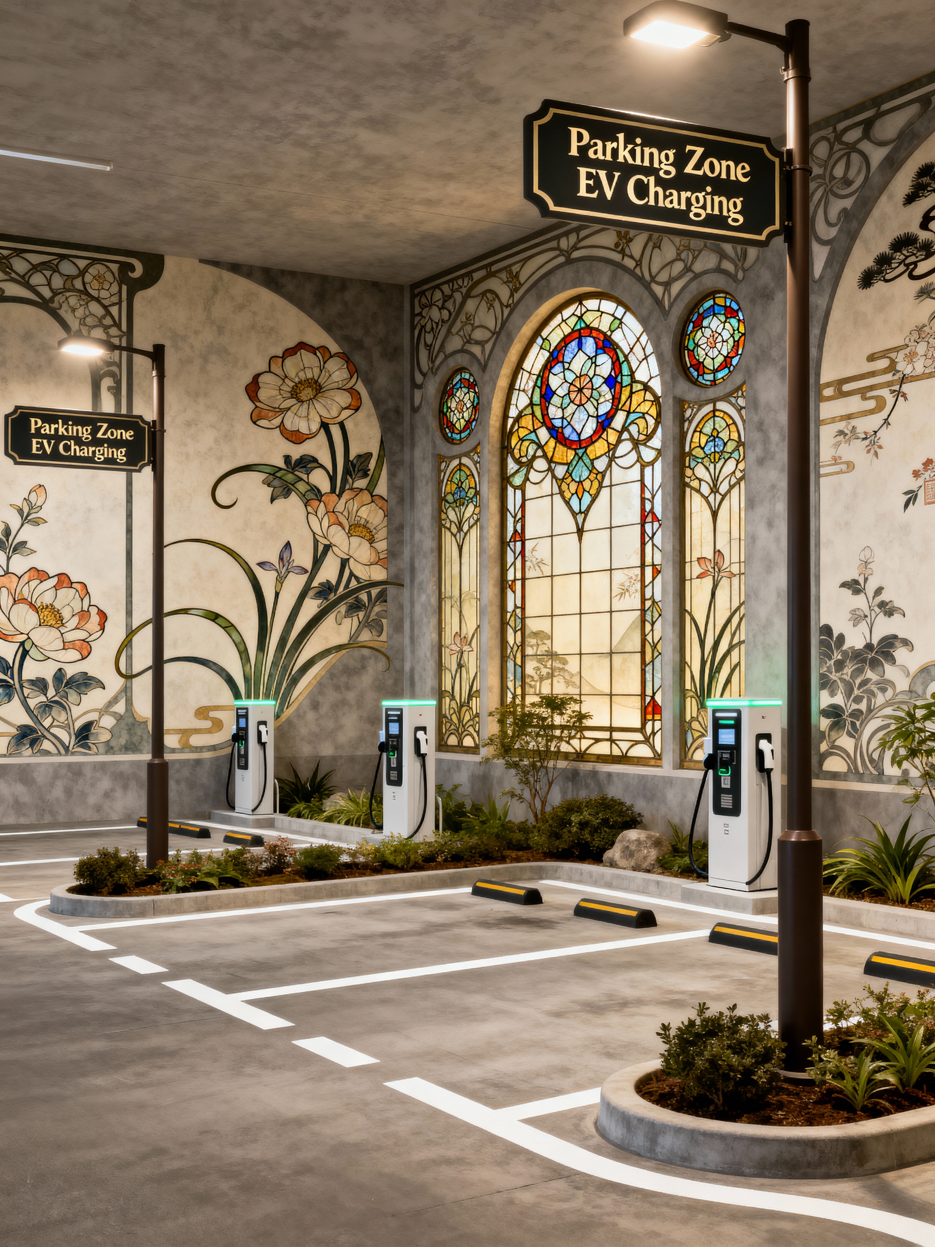 parking lot with art nouveau style with signage and markings and ev charging stations and payment kiosks and parking lot and landscaping elements and lighting poles and white parking lot stripes. . with asymmetrical shapes and wallpaper patterns of stylized flowers and stained glass and arches and curved forms and curving, plant-like embellishments and ashy colors and japanese motifs and soft, rounded lines