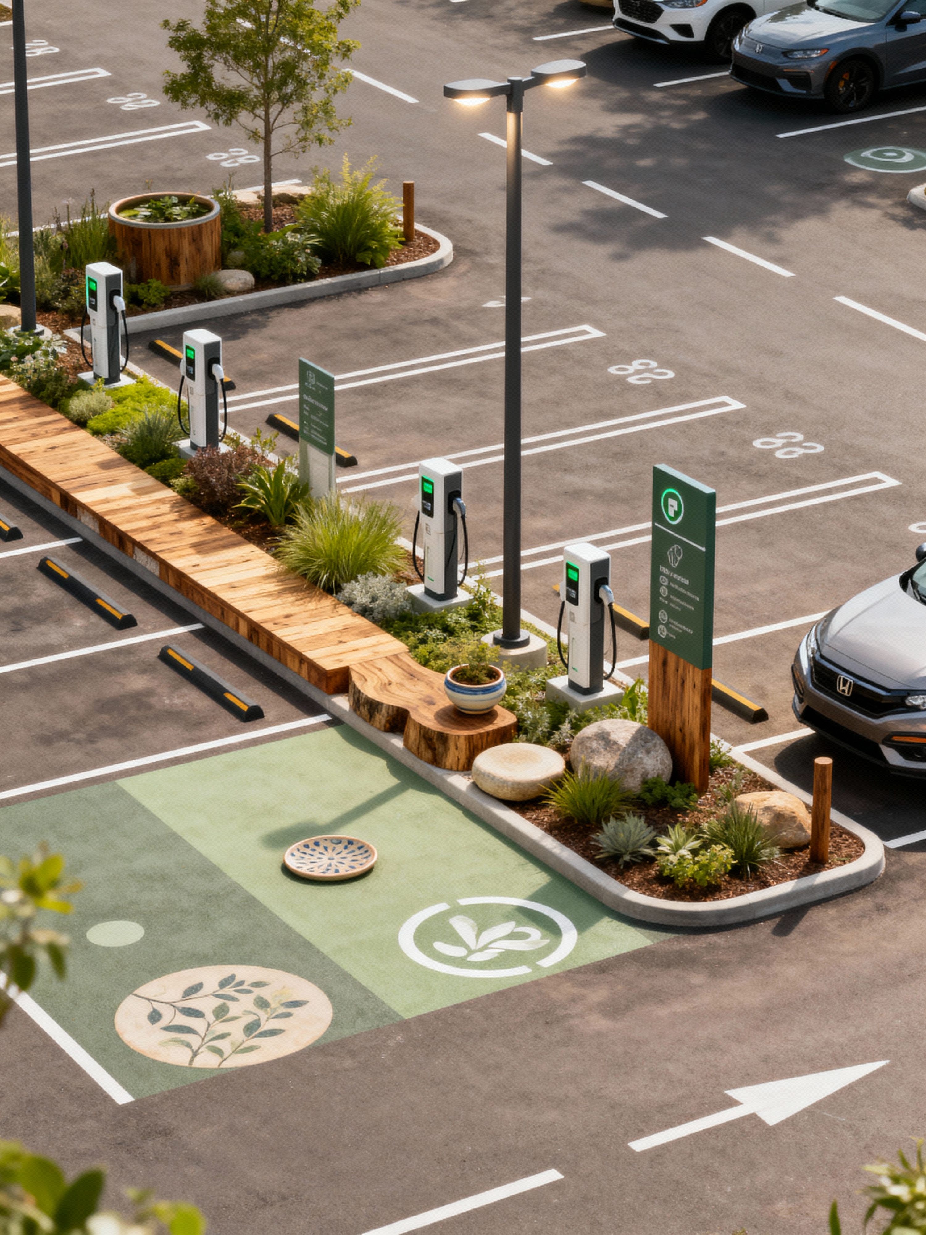 parking lot with biophilic style with drive lanes and lighting poles and parking spaces and landscaping elements and markings and parking lot and signage and ev charging stations. . with images of nature and fresh air and ceramic materials and features of nature and calming style and natural shapes and forms and wood materials and natural environment