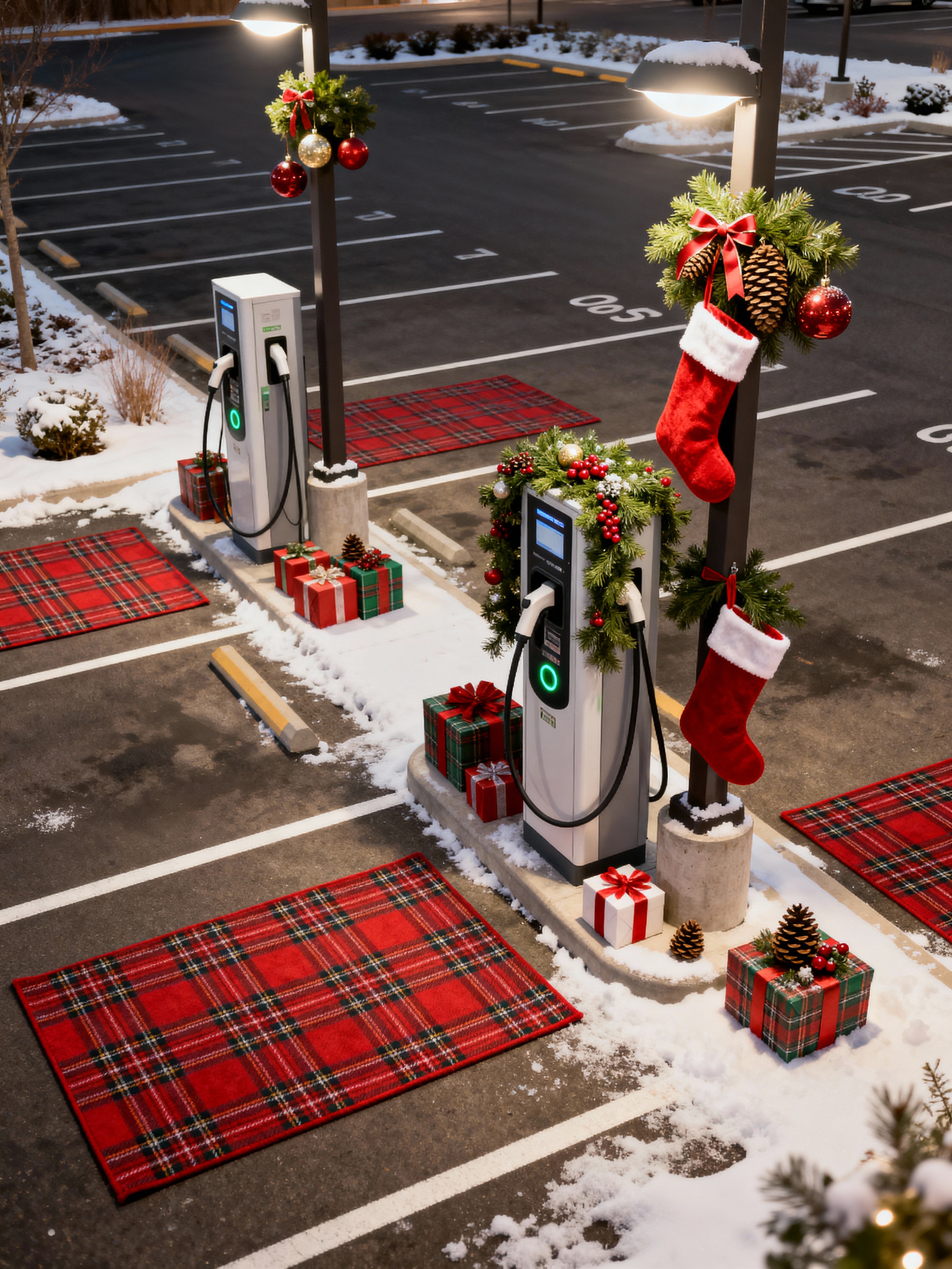 parking lot with christmas style with parking lot and drive lanes and markings and ev charging stations and landscaping elements and parking lot and lighting poles and payment kiosks. . with plaid rugs and snow outside and giftwrapped gifts and christmas ornaments and berries and greenery draped and a few big socks hanging and tie pinecones and berries and ribbons