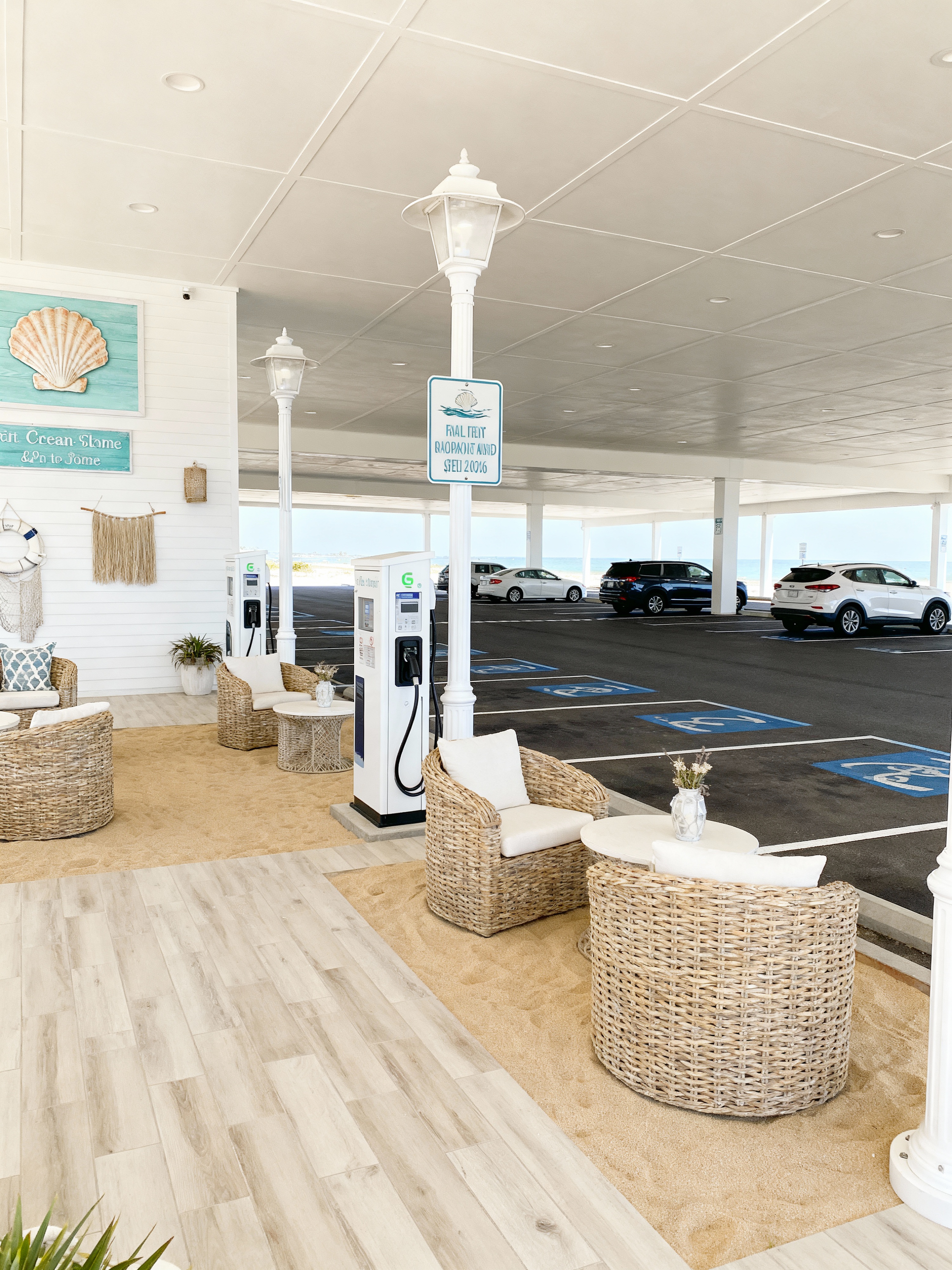 parking lot with coastal style with parking lot and signage and lighting poles and ev charging stations and parking lot and payment kiosks and drive lanes and parking spaces. . with beach vibes and nautical decor and airy feel and wicker furniture and ocean-inspired and white decor and natural materials and sand tones