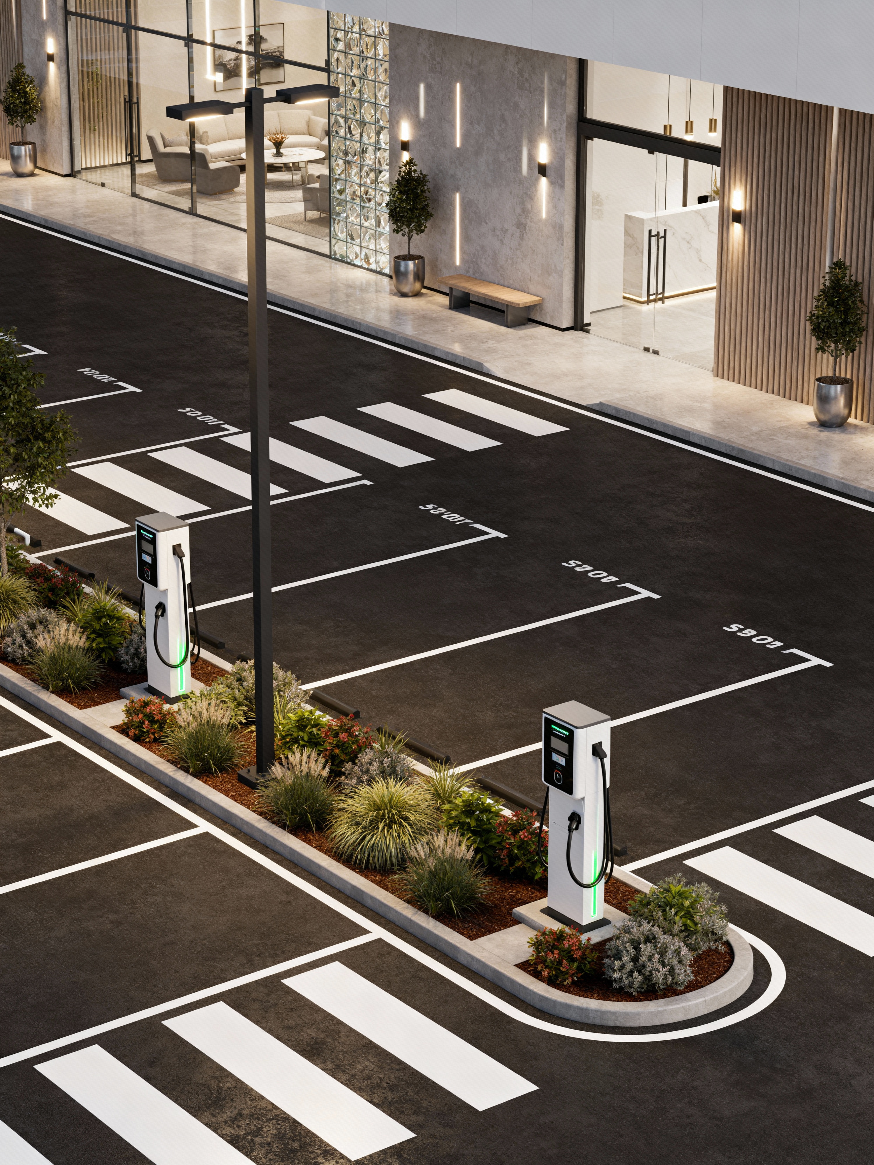 parking lot with contemporary style with ev charging stations and landscaping elements and parking spaces and lighting poles and drive lanes and markings and white parking lot stripes and payment kiosks. . with neutral palette and metal accents and high contrast and glass decor and modern finishes and elegant simplicity and functional design and open spaces