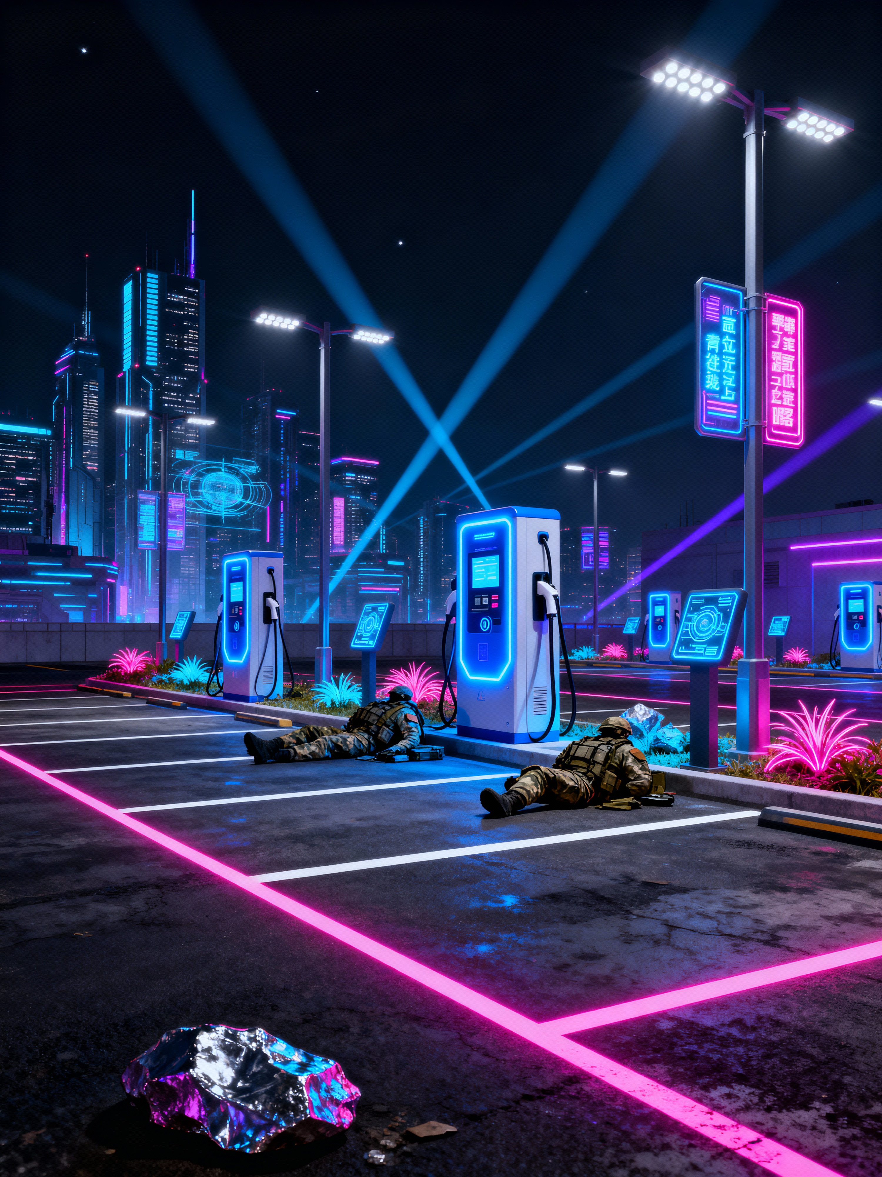 parking lot with cyberpunk style with ev charging stations and white parking lot stripes and payment kiosks and parking lot and drive lanes and lighting poles and signage and landscaping elements. . with synthetic objects and bladerunner lights and military uniforms and gear and dark night and black lights and futuristic cybernetic details and cyberpunk lights and futuristic cybernetic city