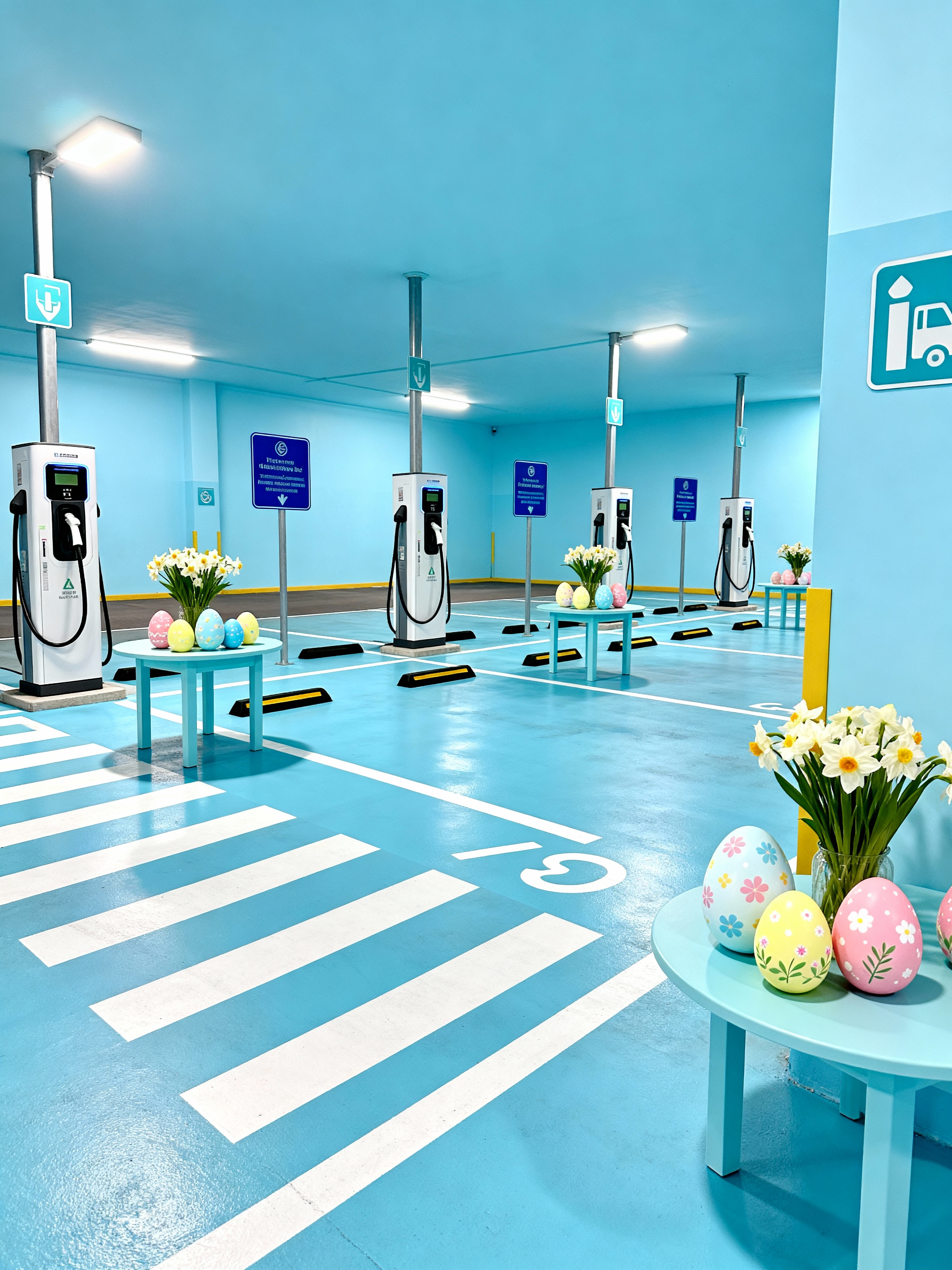 parking lot with easter style with ev charging stations and signage and parking spaces and white parking lot stripes and lighting poles and parking lot and markings and parking lot. . with spring decorations and easter decorations and flowers on table and light blue colors and colorful easter eggs and spring decorations