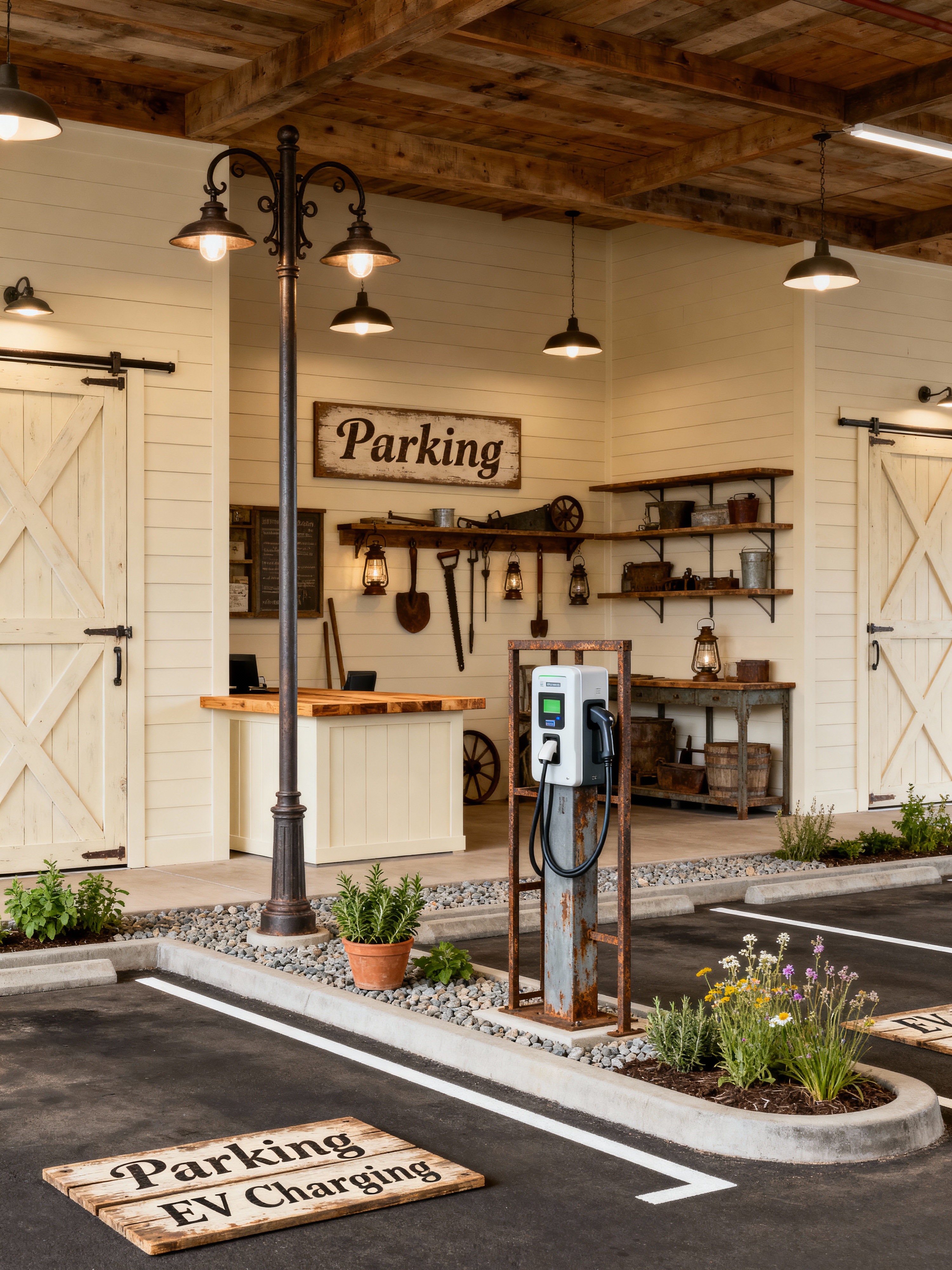 parking lot with farmhouse style with drive lanes and payment kiosks and lighting poles and ev charging stations and parking lot and signage and landscaping elements and parking spaces. . with exposed wood and shiplap walls and vintage decor and country style and cozy feel and industrial accents and barn doors and open shelving
