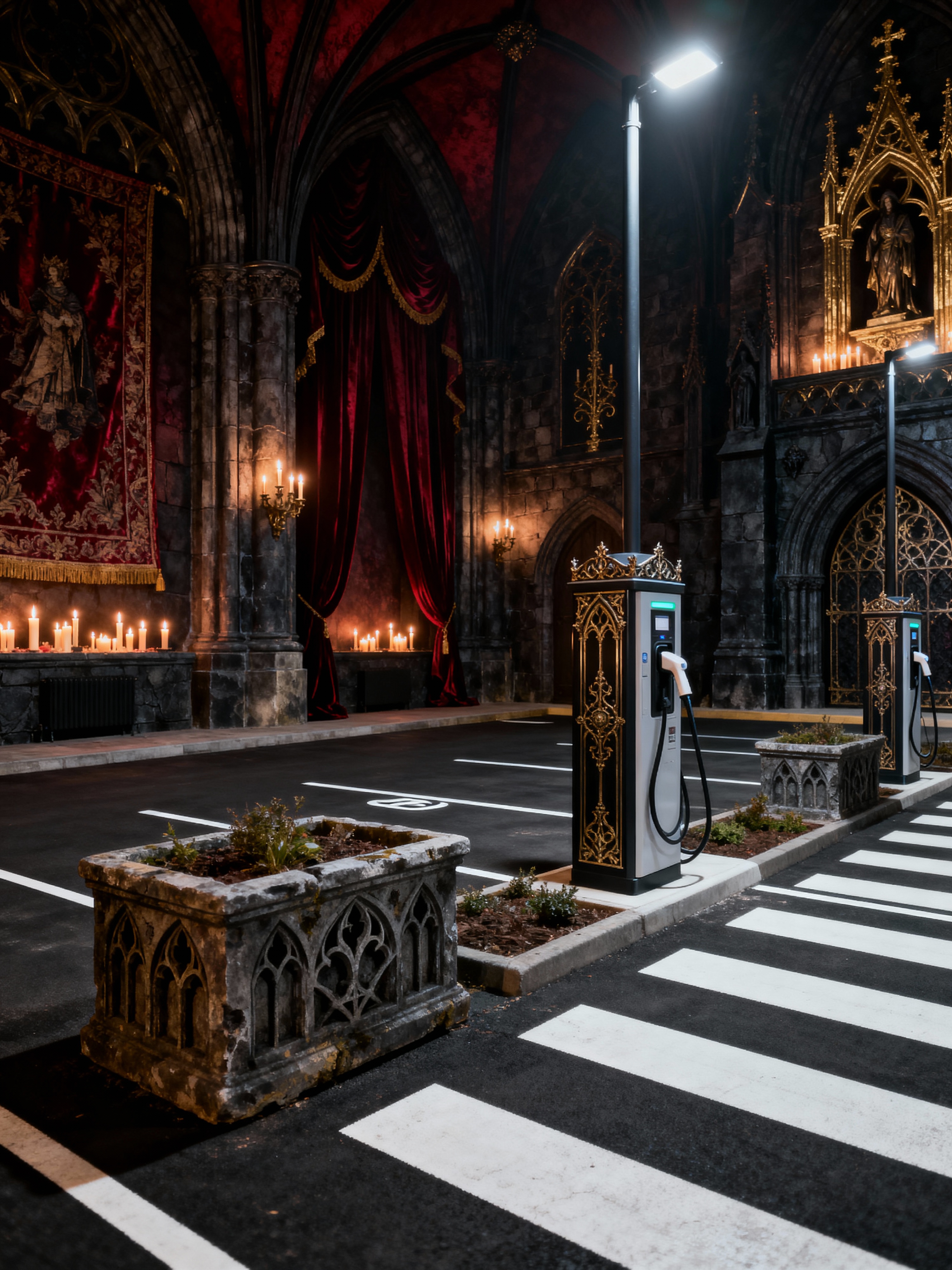 parking lot with gothic style with parking lot and white parking lot stripes and lighting poles and markings and ev charging stations and landscaping elements and parking spaces and payment kiosks. . with medieval influence and cathedral style and rich fabrics and mysterious mood and ornate details and candlelit ambiance and dark colors and stone textures